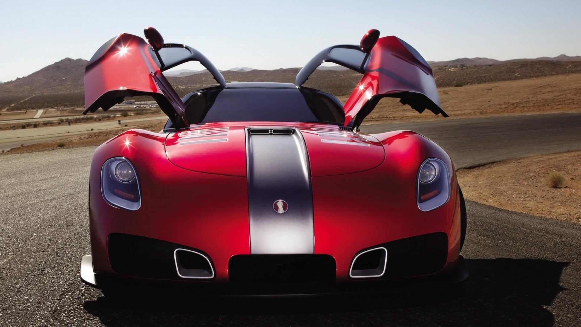 Coche deportivo rojo en la carretera de asfalto junto al césped verde