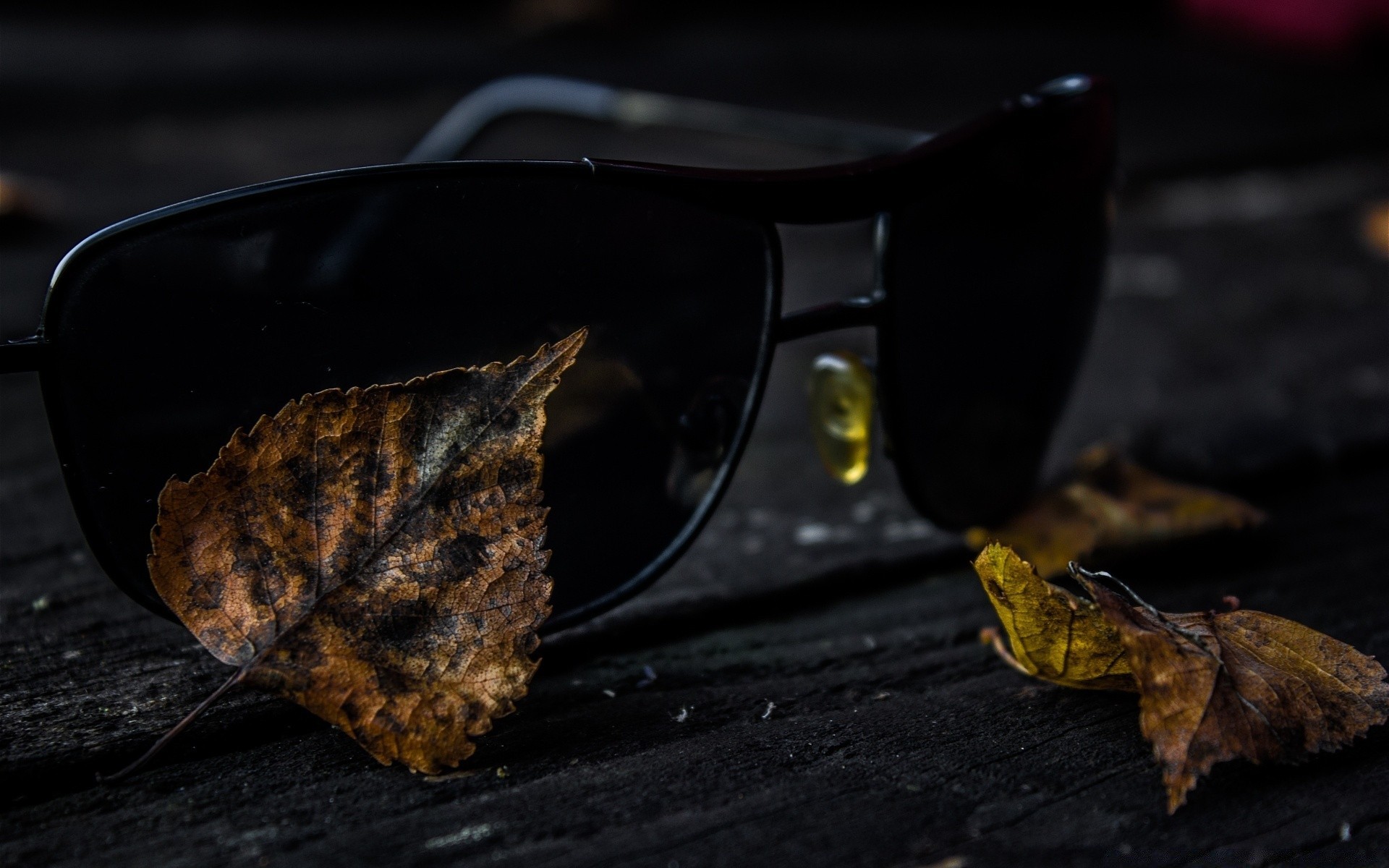 Gafas negras en un banco entre follaje caído