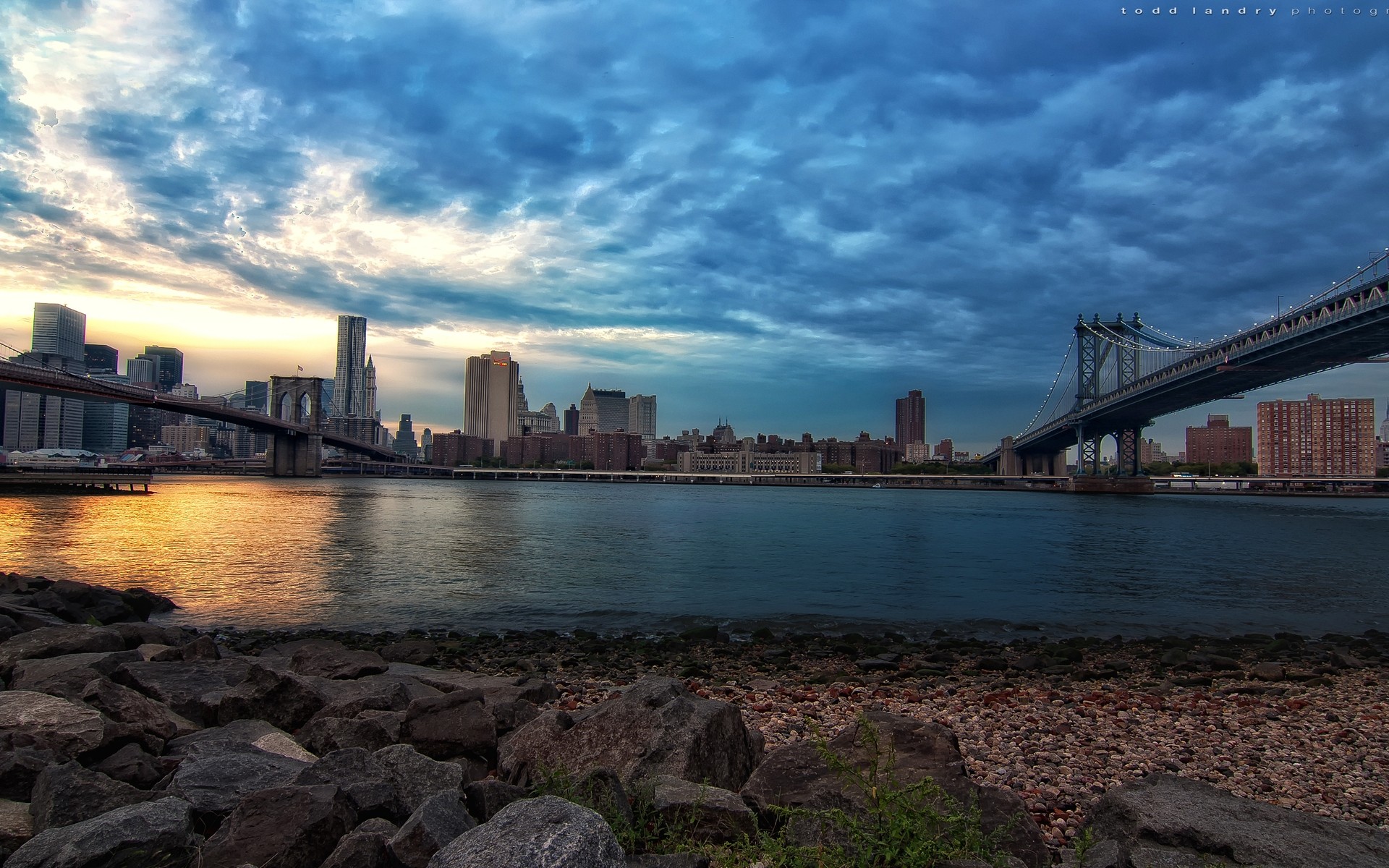 Puente nocturno de Brooklyn en nueva York sobre el East River