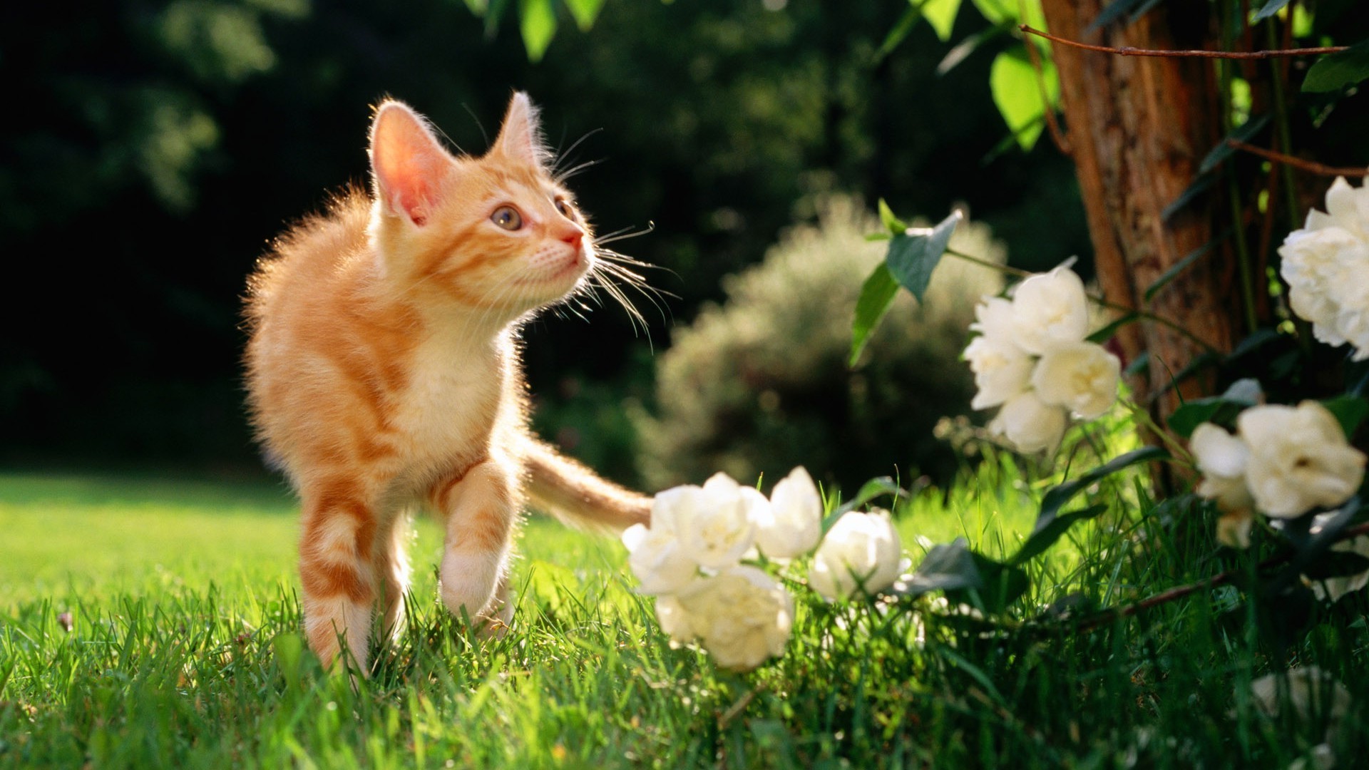 Gato en la hierba junto a un árbol con flores