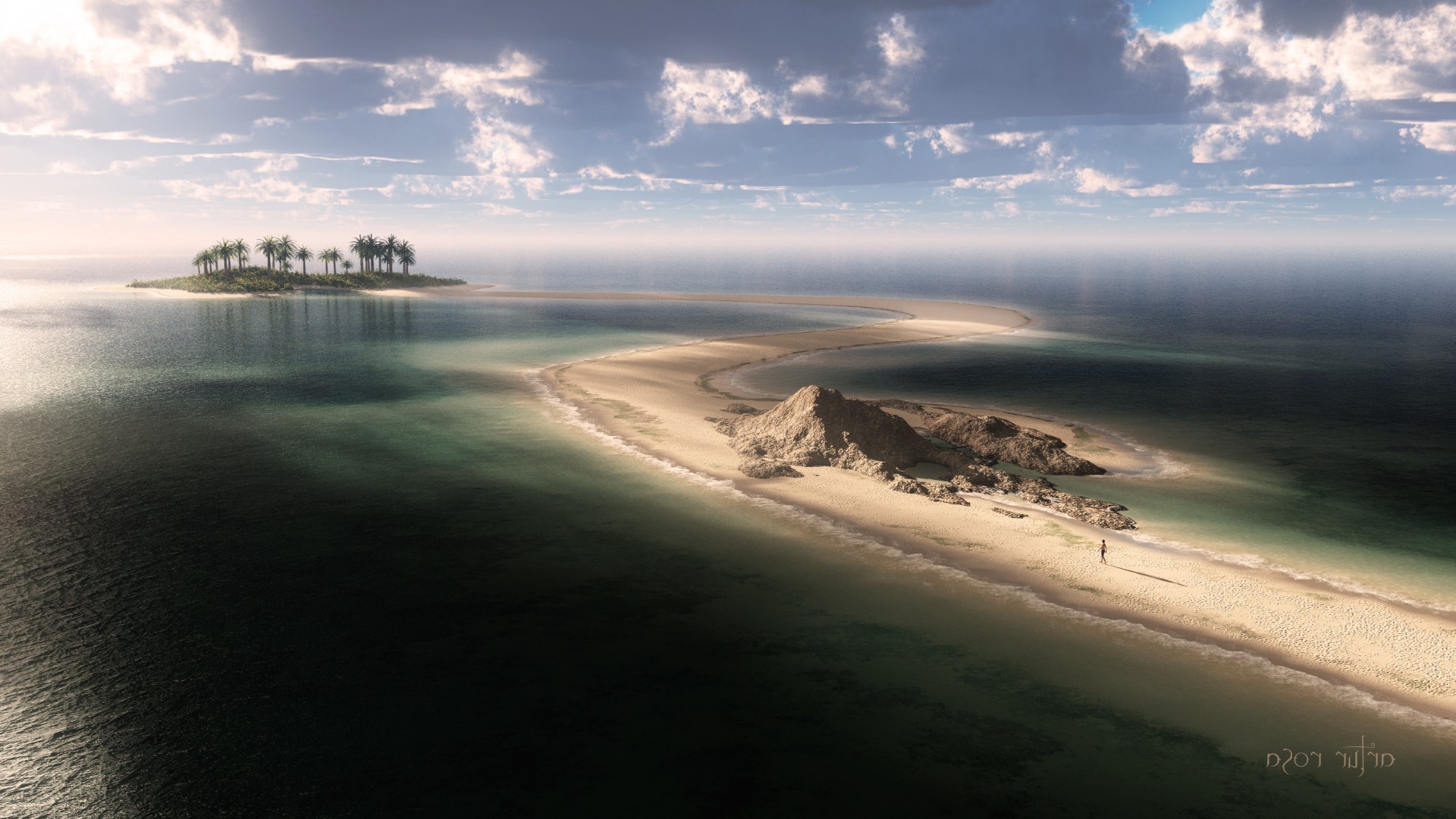 Un pequeño islote con un montón de palmeras en un mar infinitoUn pequeño islote con un montón de palmeras en un mar infinito
