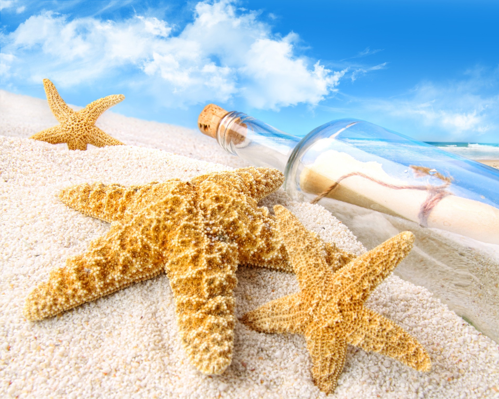 En la playa se encuentra una estrella de mar y conchas marinas y una botella con una carta