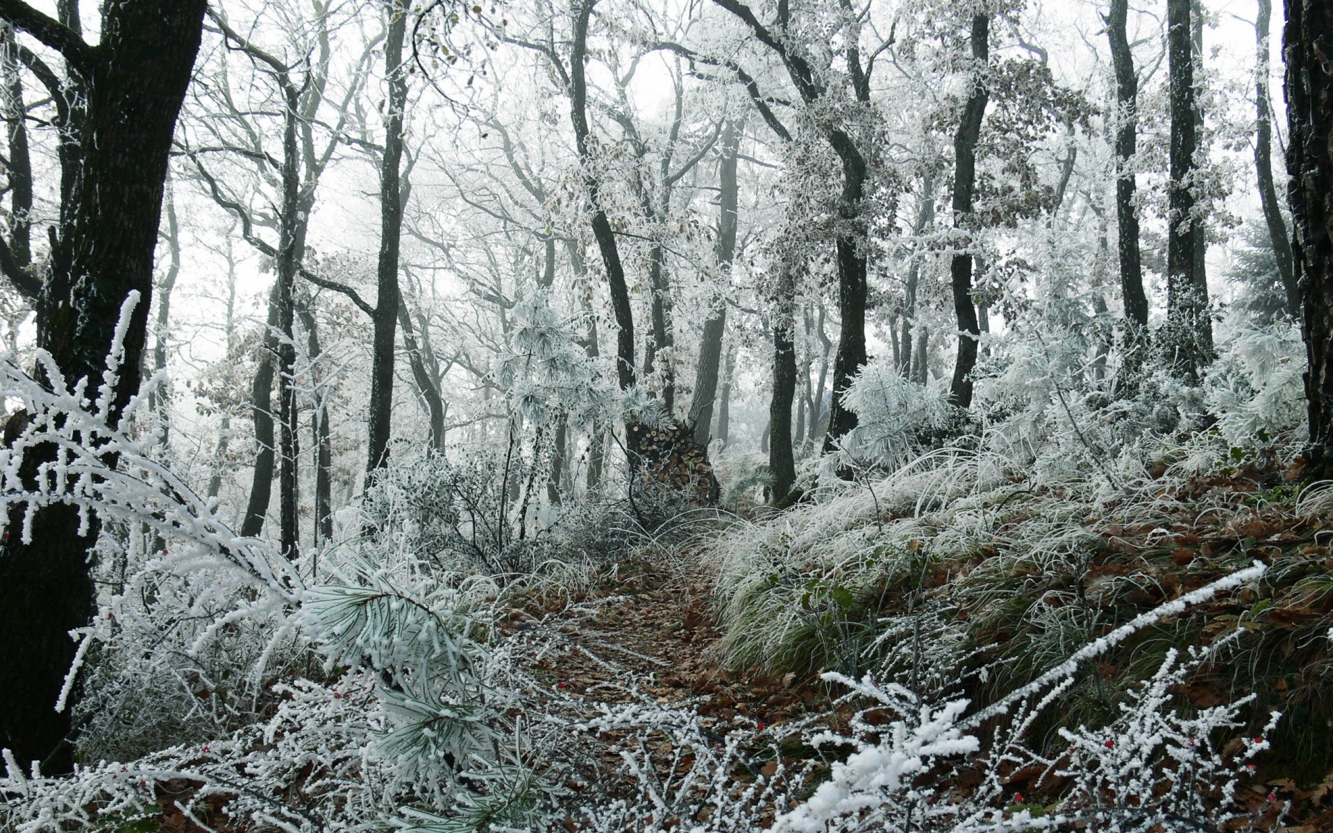 Camino entre ventisqueros en un bosque cubierto de nieveCamino entre ventisqueros en un bosque cubierto de nieve