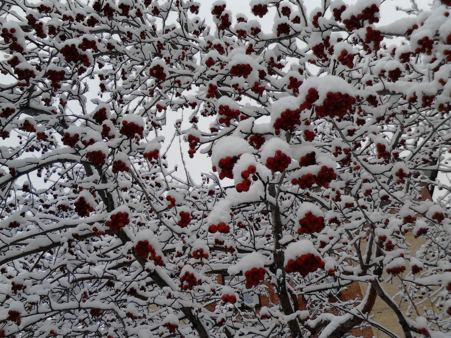 Ramas cubiertas de nieve de los árboles en el fondo de una puesta de sol carmesí