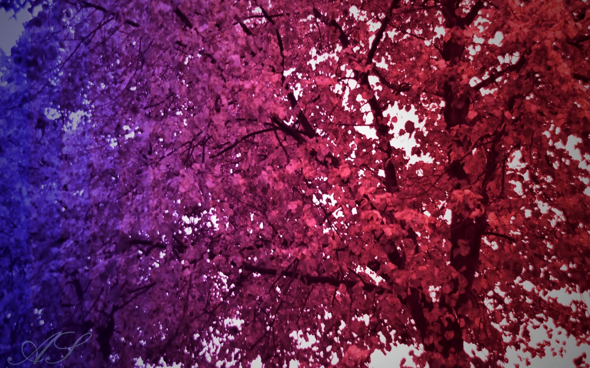 La corona de un árbol que va al cielo con hojas en tonos rojosLa corona de un árbol que va al cielo con hojas en tonos rojos