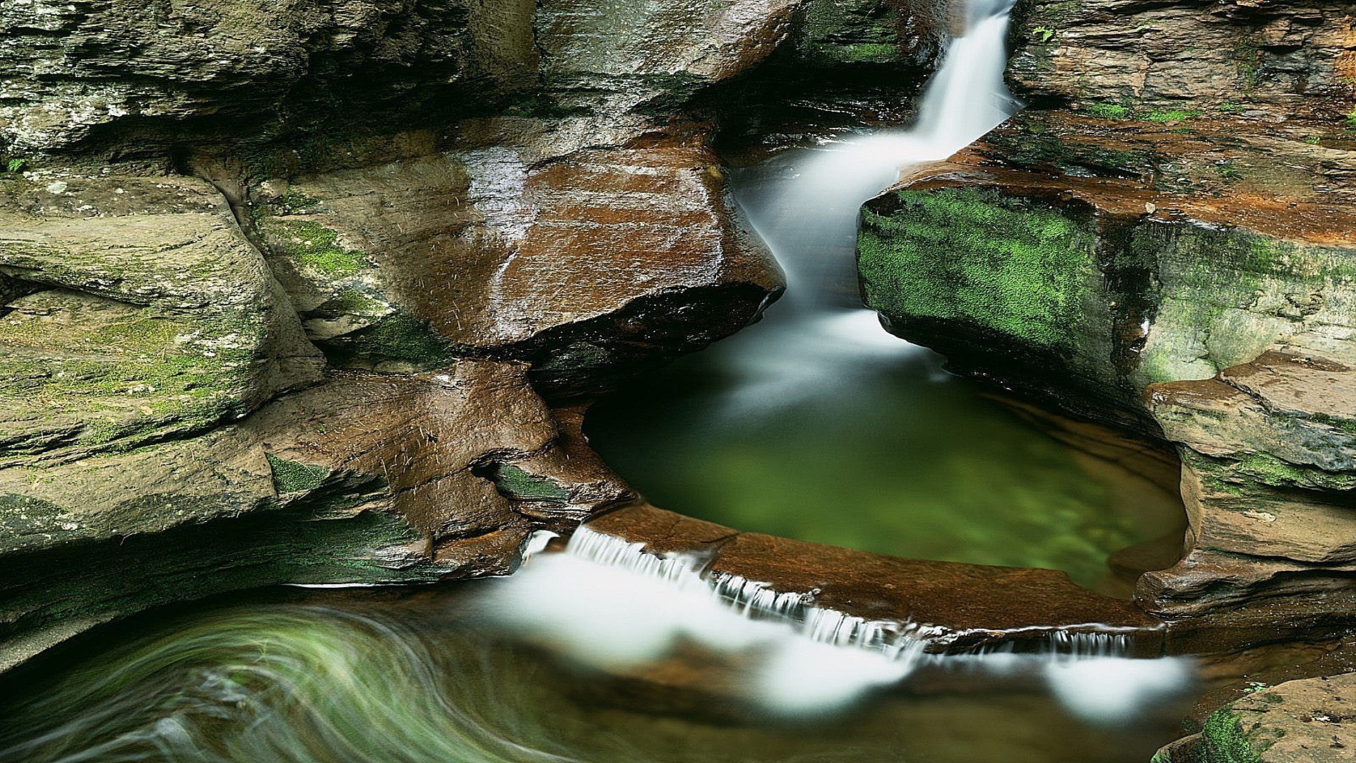 Corrientes de agua corriendo sobre las rocas en el fondo del cielo nublado