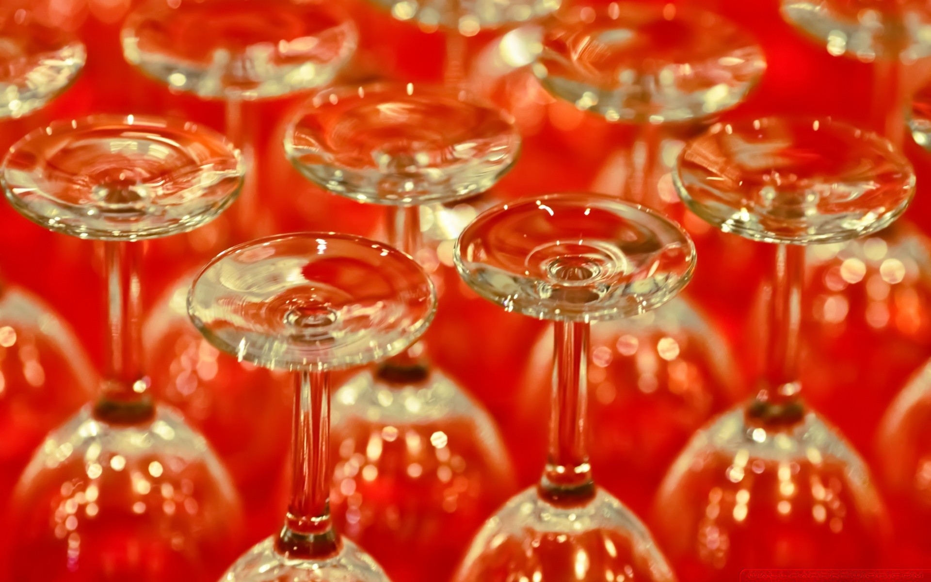 Copas de vino al revés transparentes sobre la mesa rojaCopas de vino al revés transparentes sobre la mesa roja