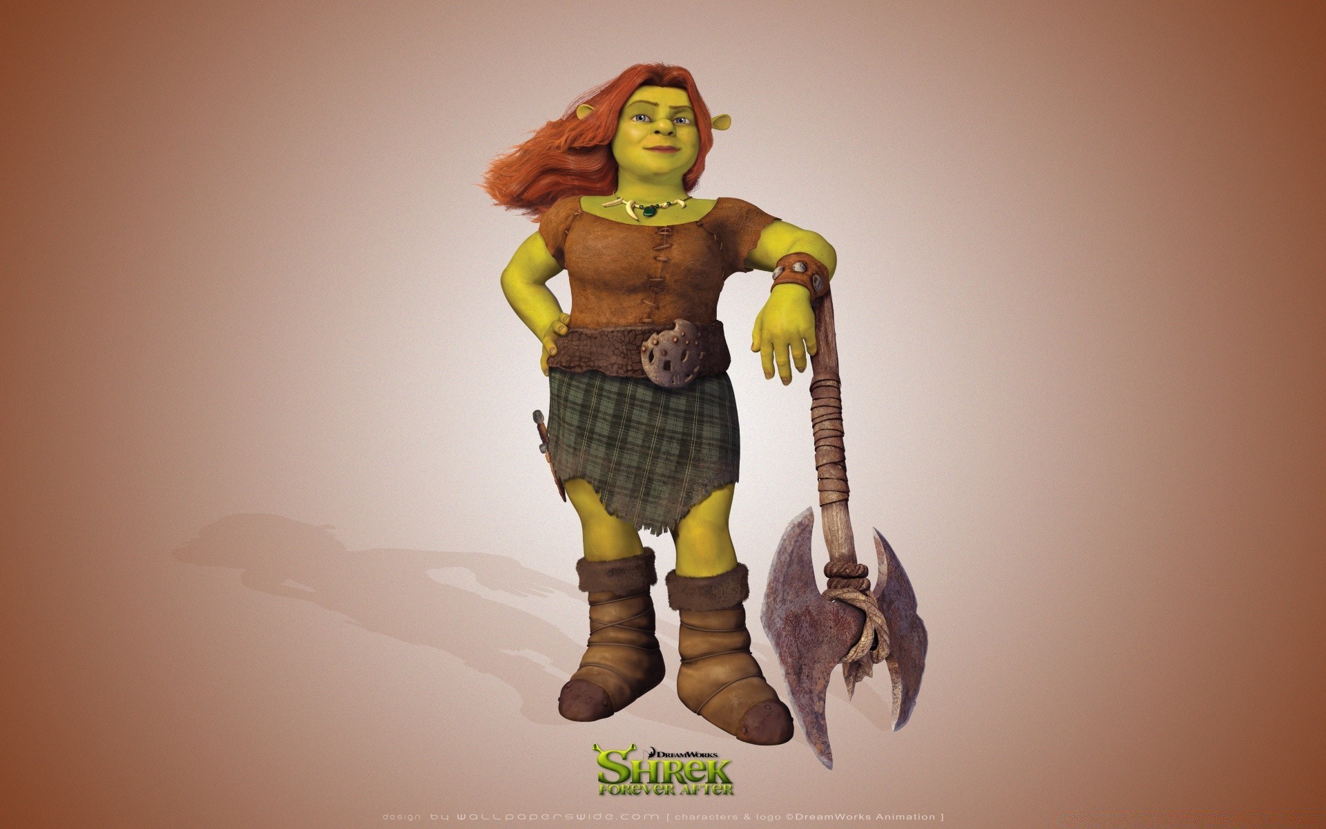 Personaje de dibujos animados Shrek. Fiona está de pie con un arma en la mano