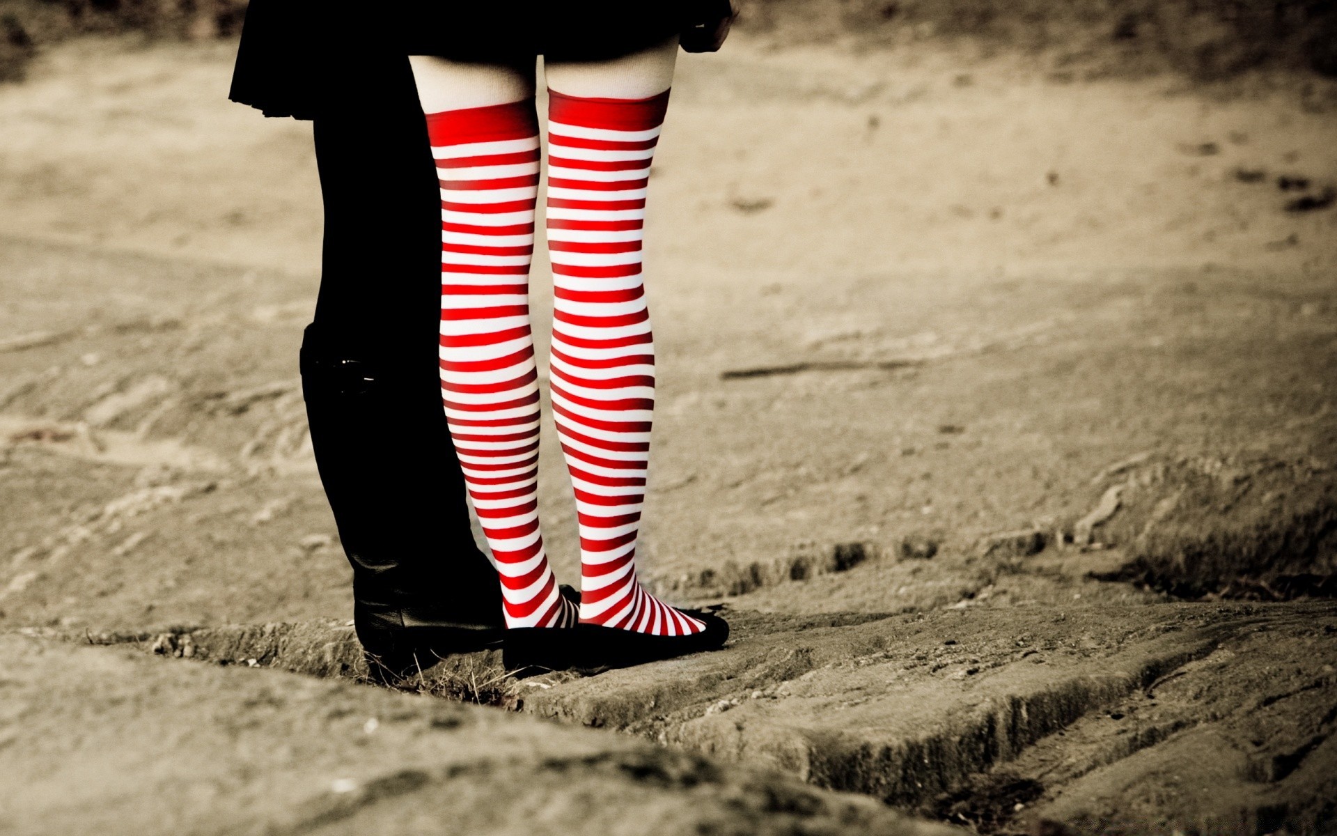 La chica de las polainas rojas de pie en la carretera