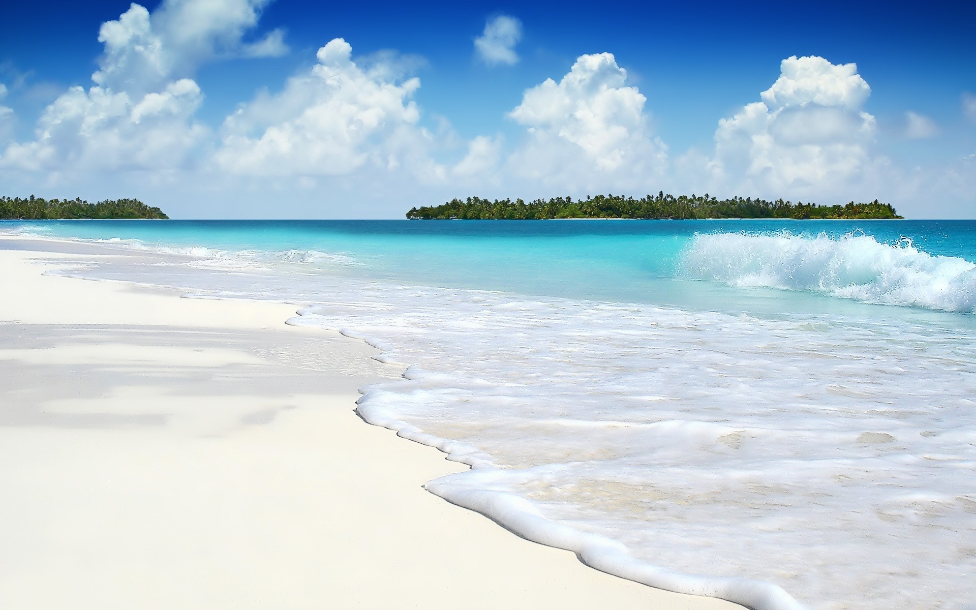 La espuma Marina del mar azul rueda sobre la costa de arena