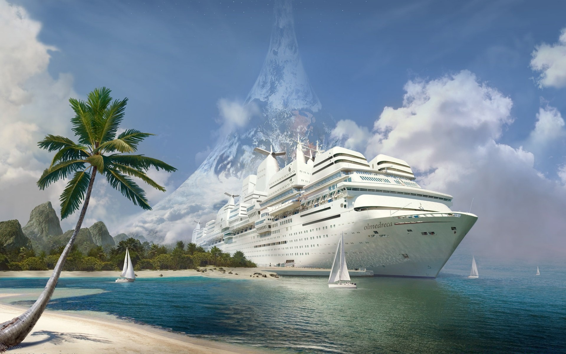 El transatlántico llega a las costas de la isla. Palmeras y el mar