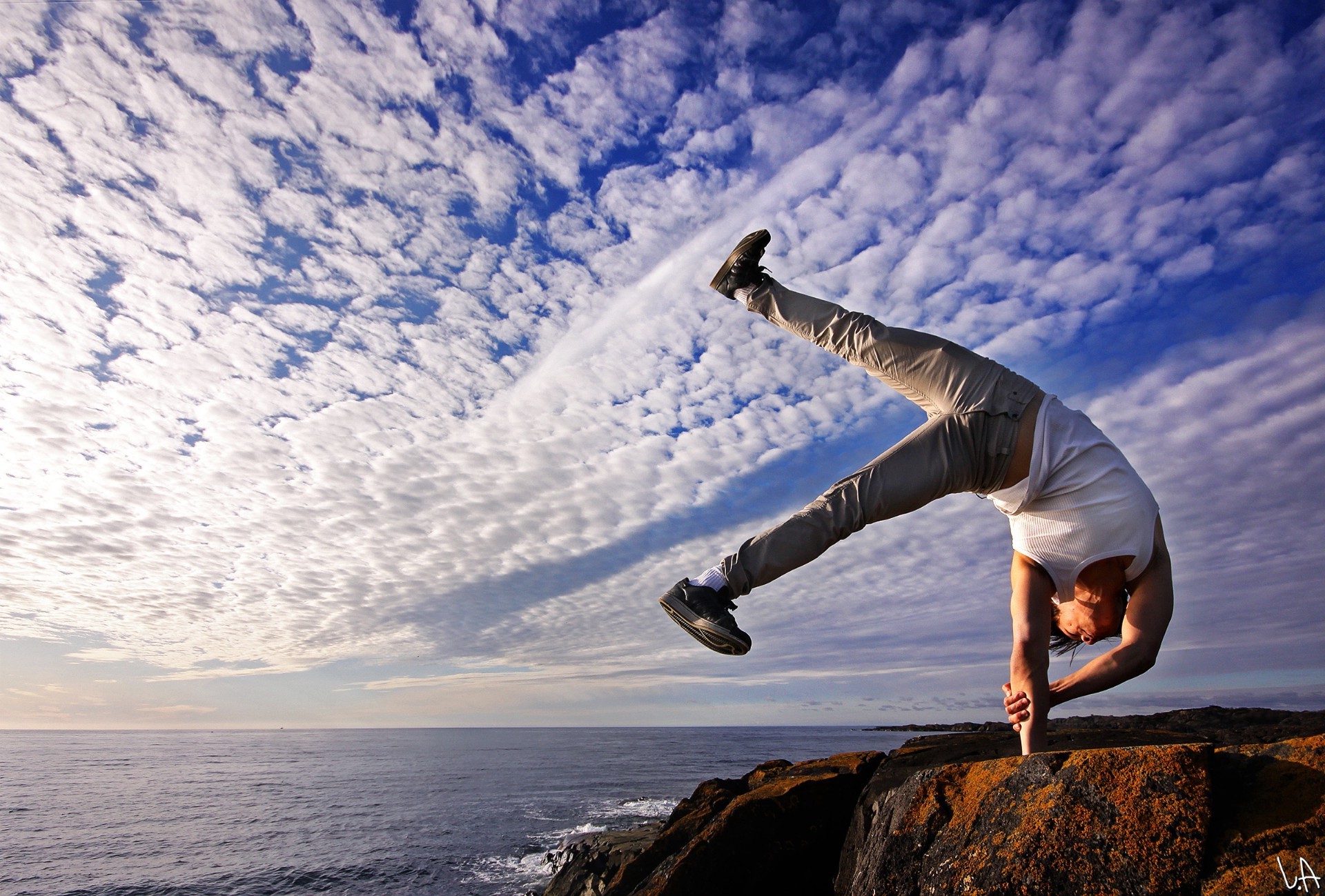 El niño realiza una parada en un brazo en el borde de un acantiladoEl niño realiza una parada en un brazo en el borde de un acantilado