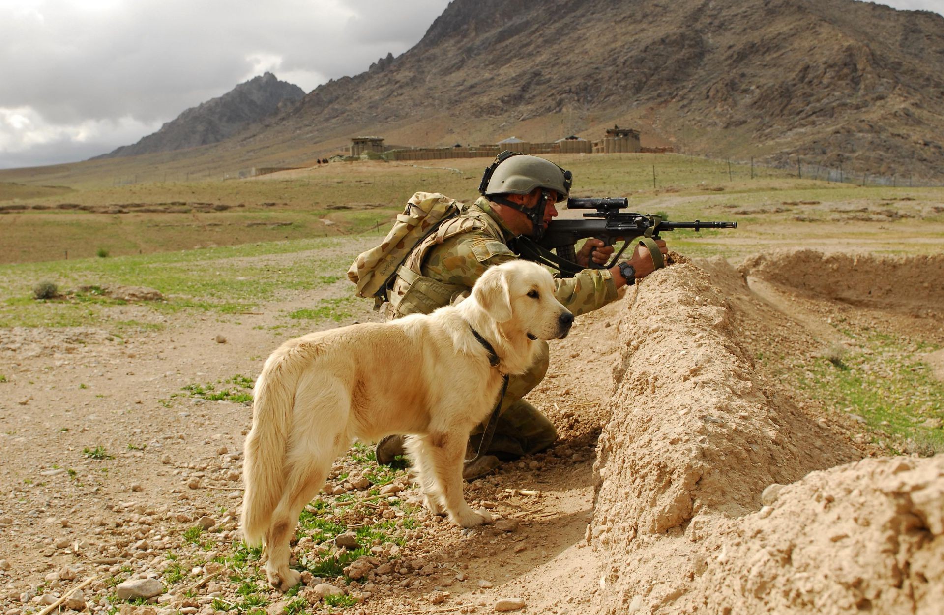 Soldado de las fuerzas especiales con un rifle y un perro en el refugioSoldado de las fuerzas especiales con un rifle y un perro en el refugio