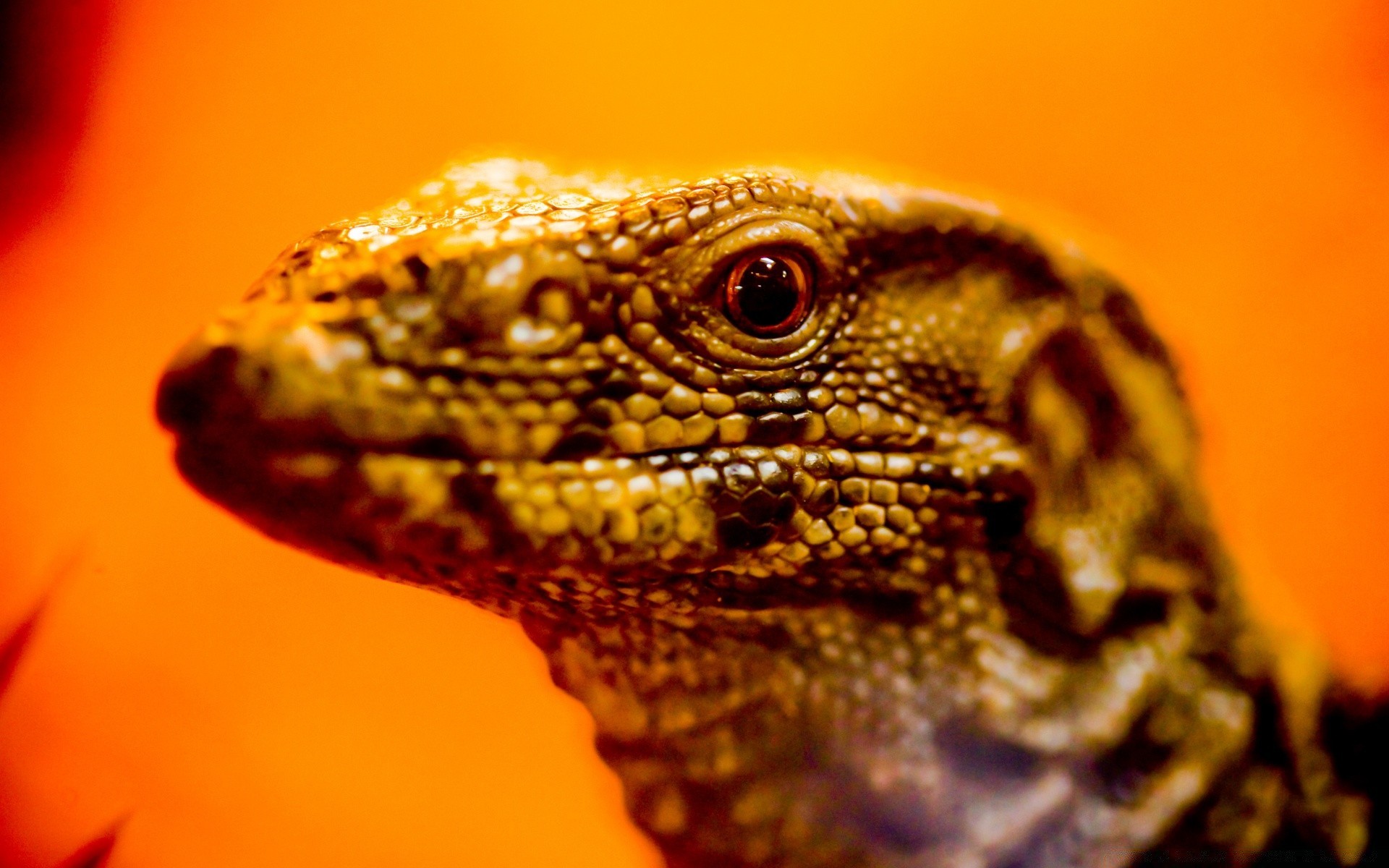 Reptil sobre un fondo naranja brillante con un ojo brillante