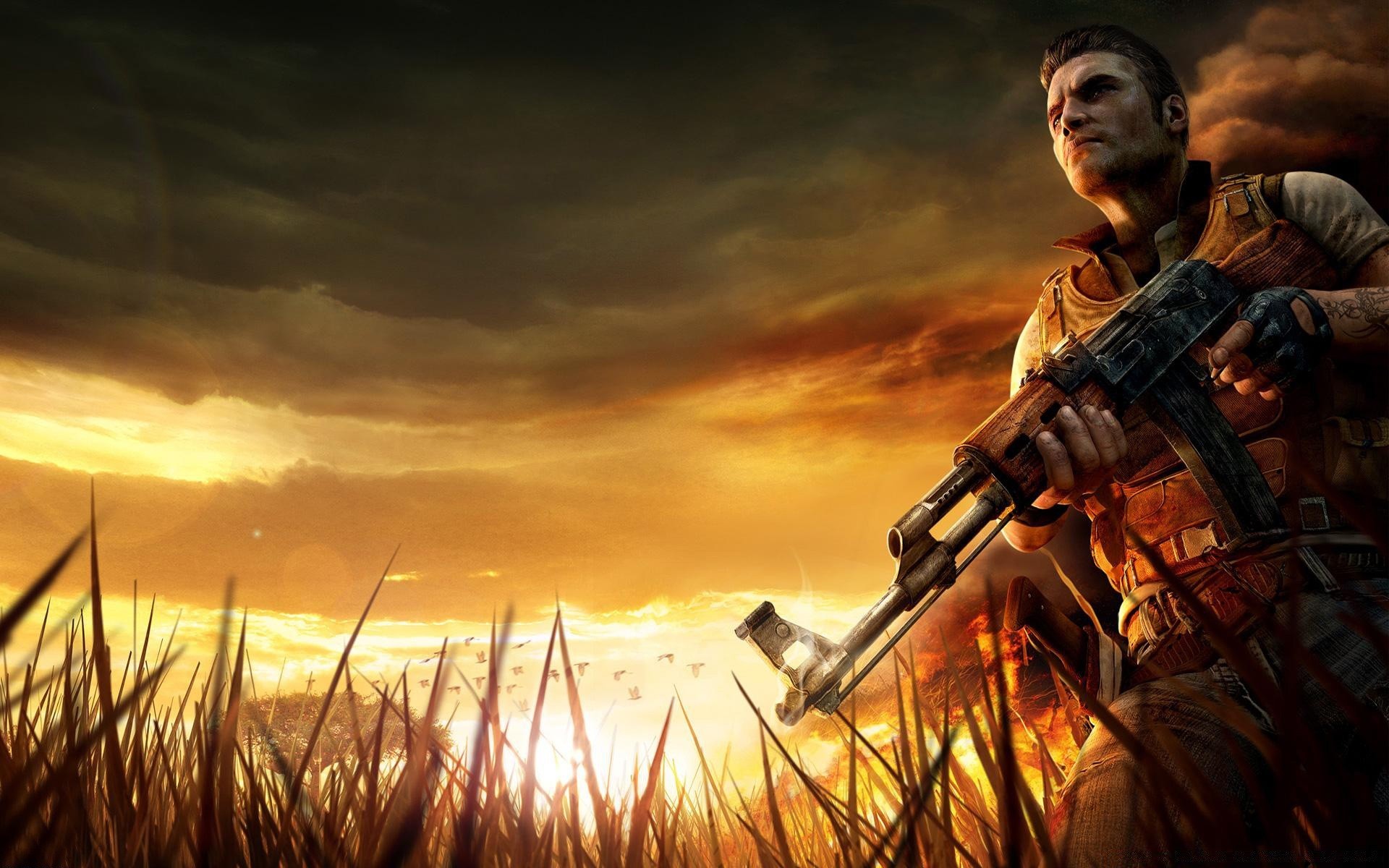El héroe del juego Farcry, armado, de pie en el fondo del paisaje de montaña