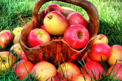 Cesta de manzanas sobre hierba verde