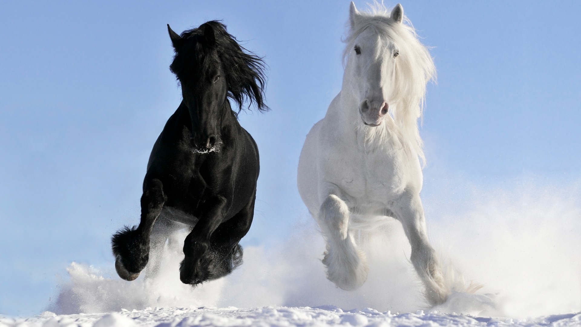 Dos caballos galopan en invierno por la nieve