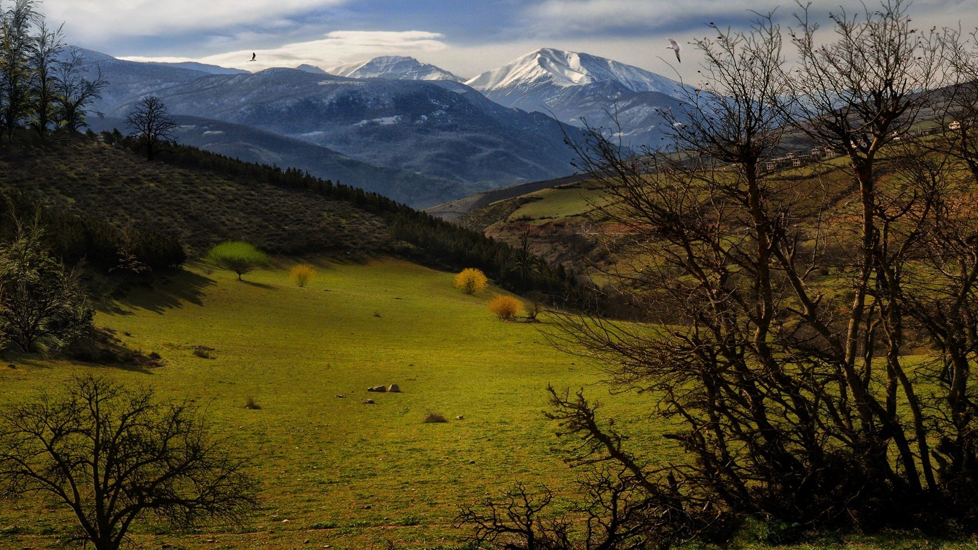 Campos verdes en el fondo de las montañas