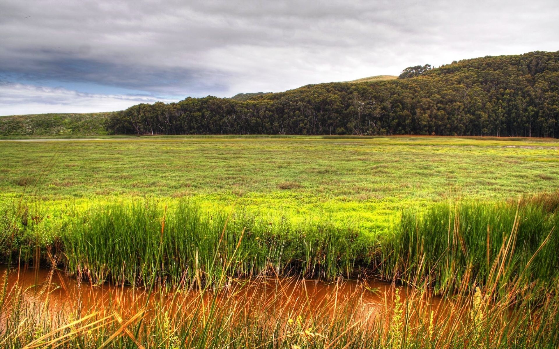 Amplio campo bajo el cielo nublado