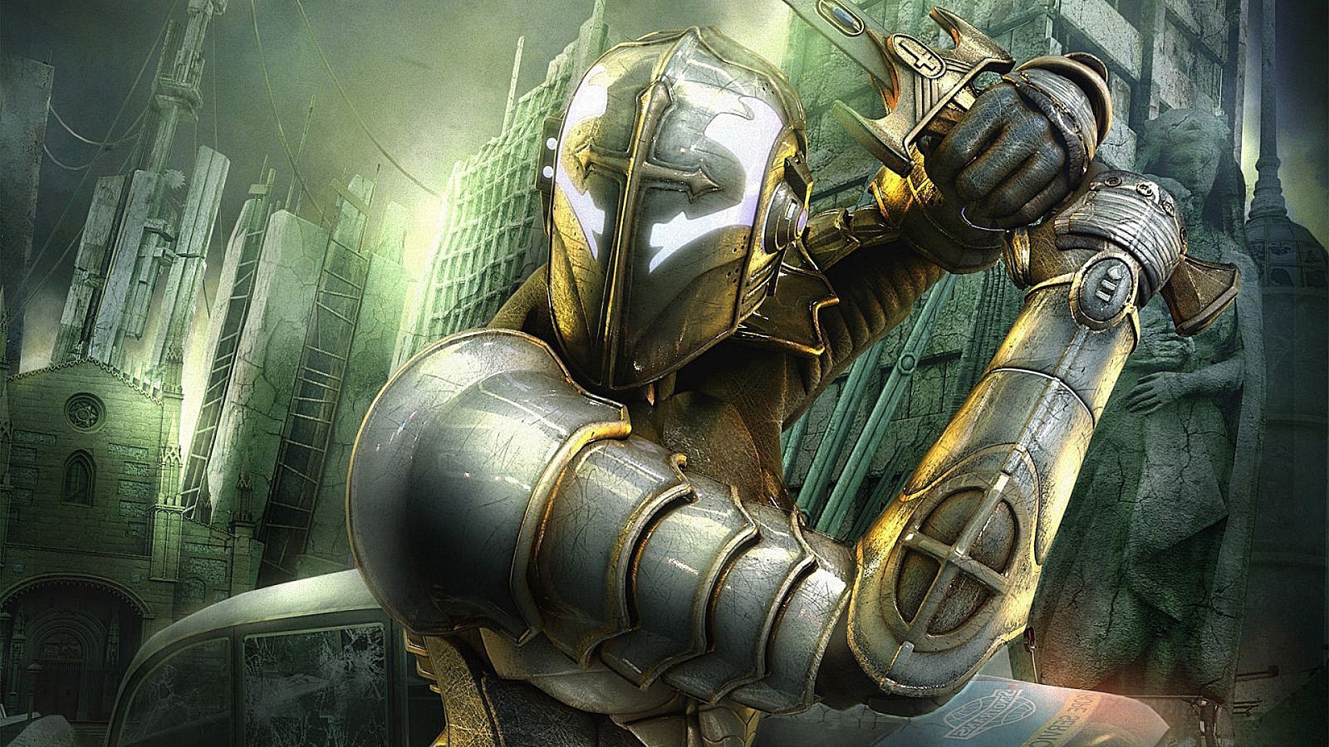 El hombre del traje de acero se defiende con una espada