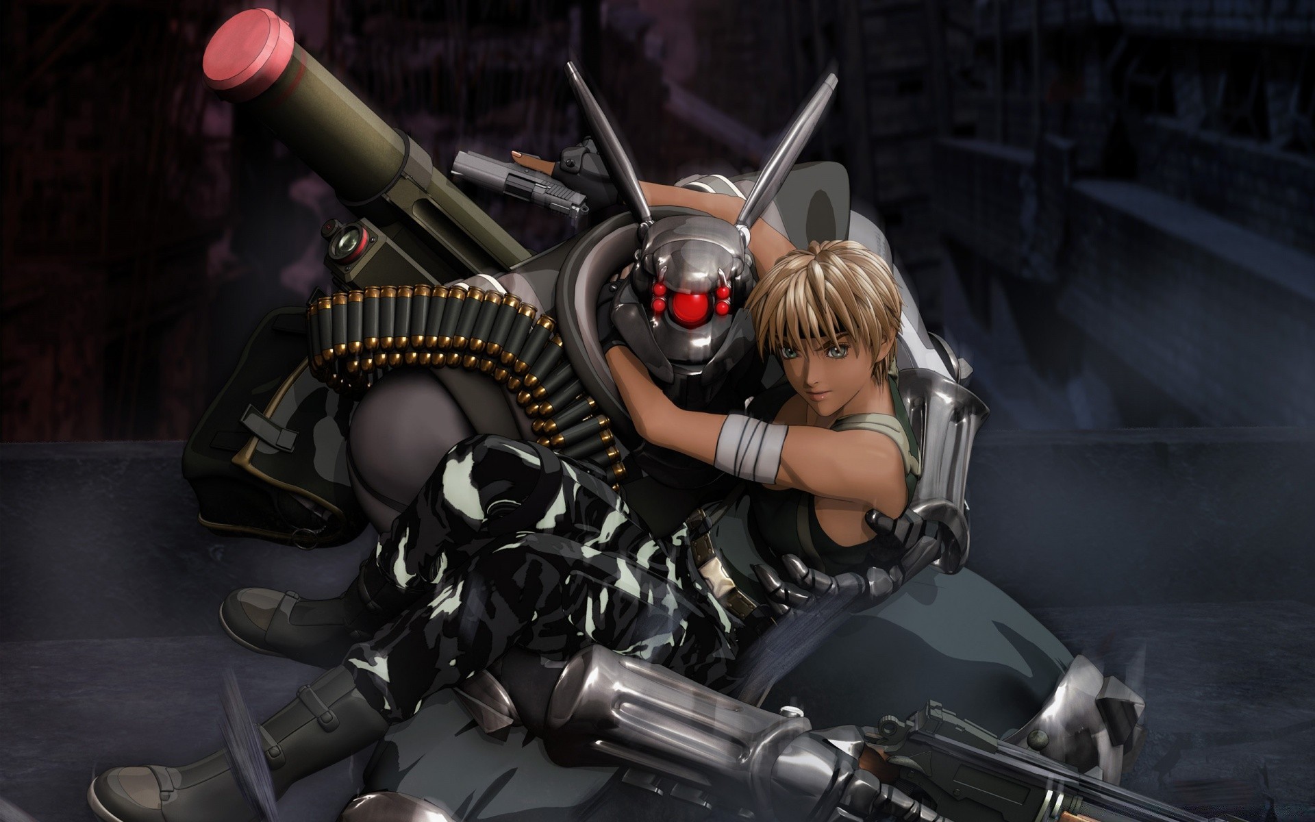 Cyborg armado con un hombre en sus brazos