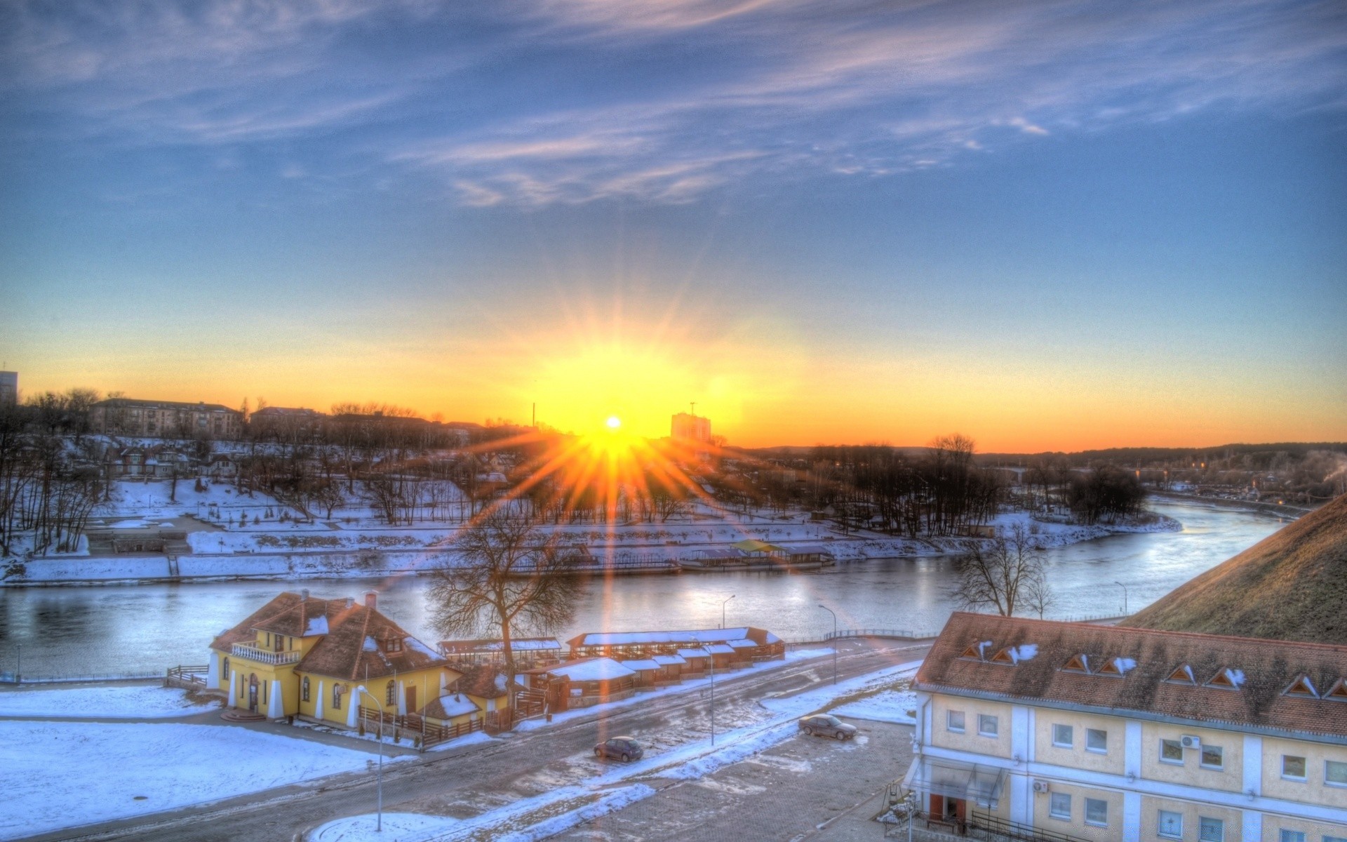 Una ciudad soñolienta junto al río de invierno