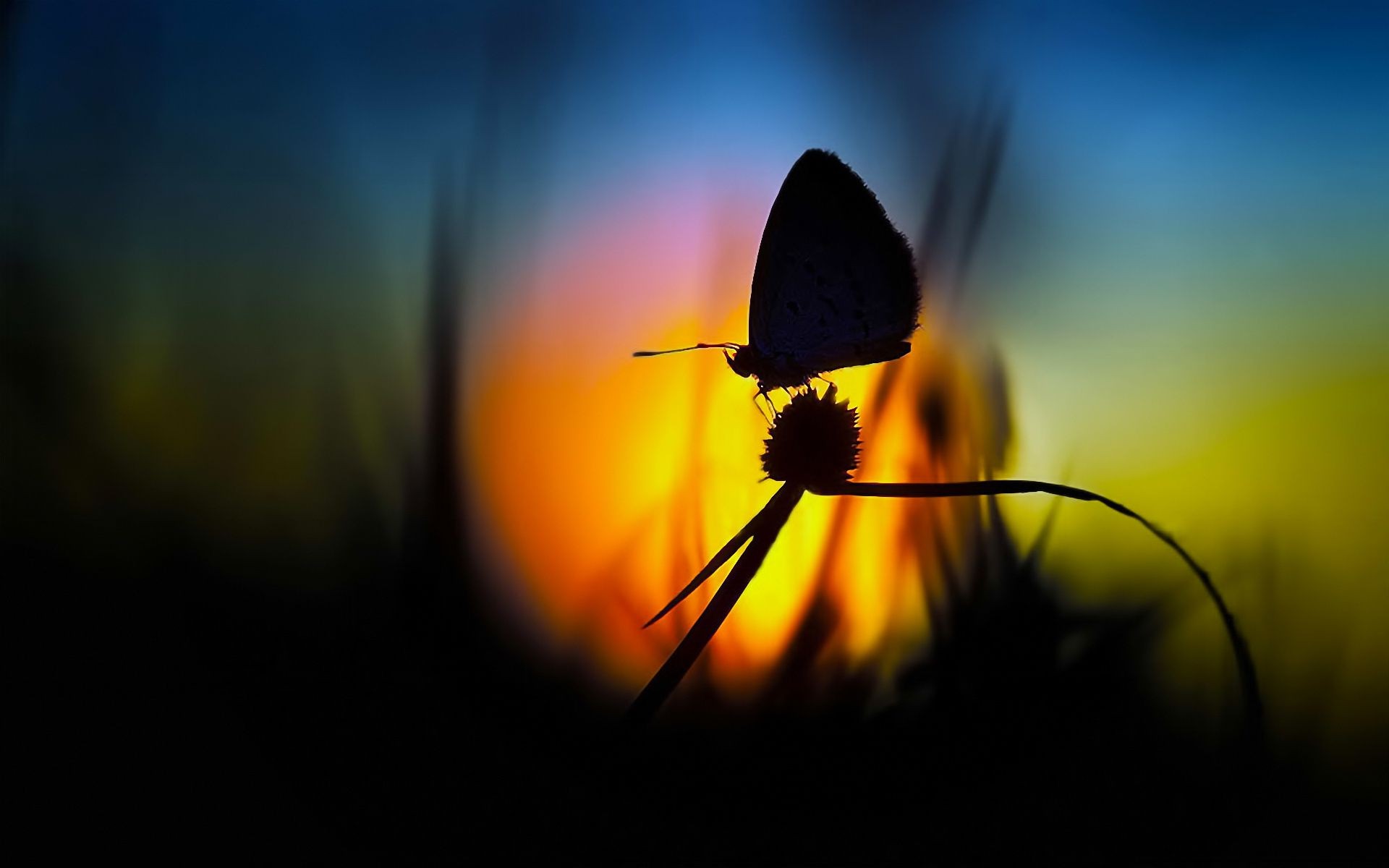 Mariposa en la flor en el fondo de la puesta de sol