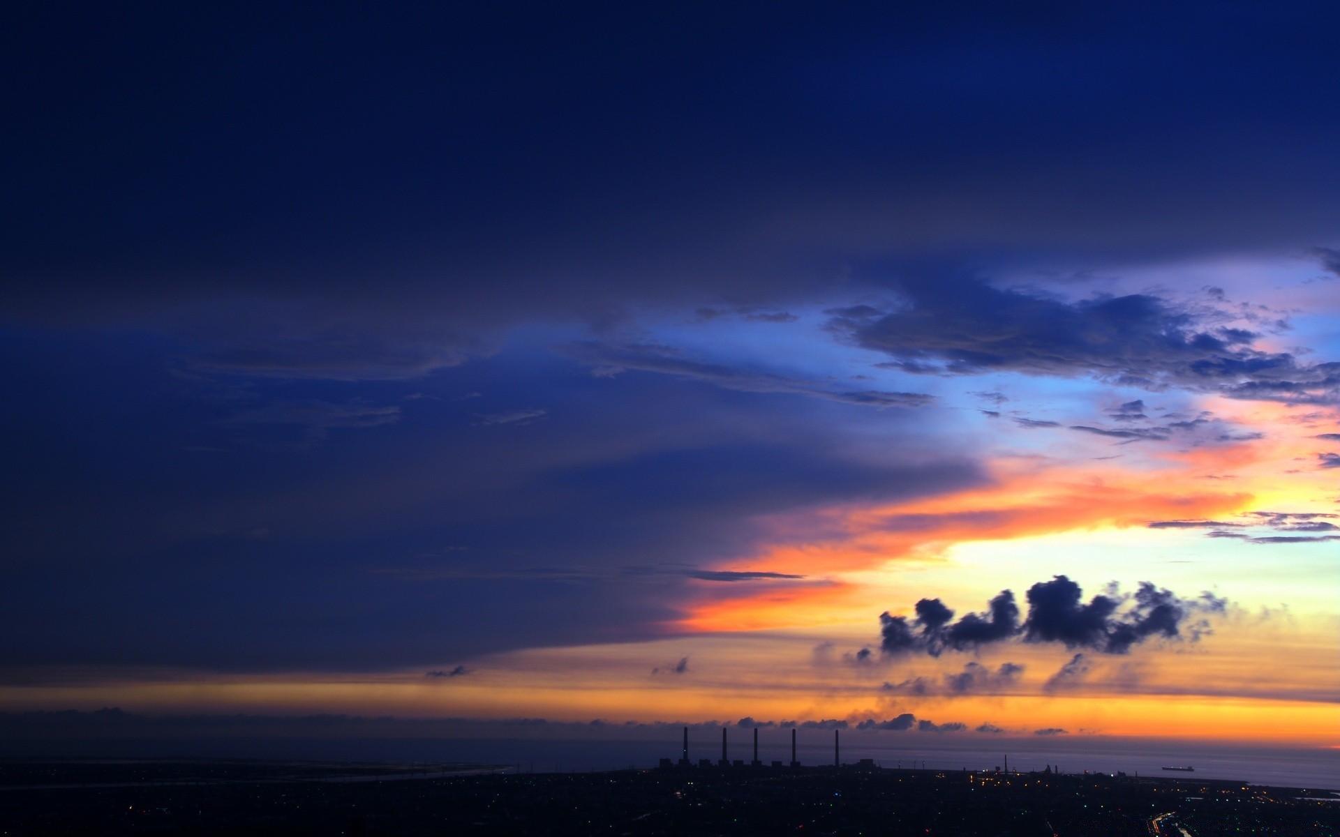 Puesta de sol vespertina. Cielo oscuro en el agua