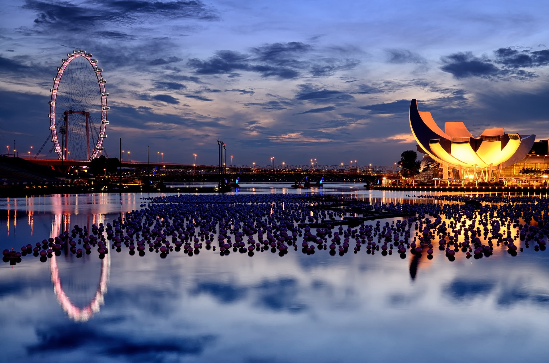 Cielo al atardecer sobre el muelle con reflejo en el agua