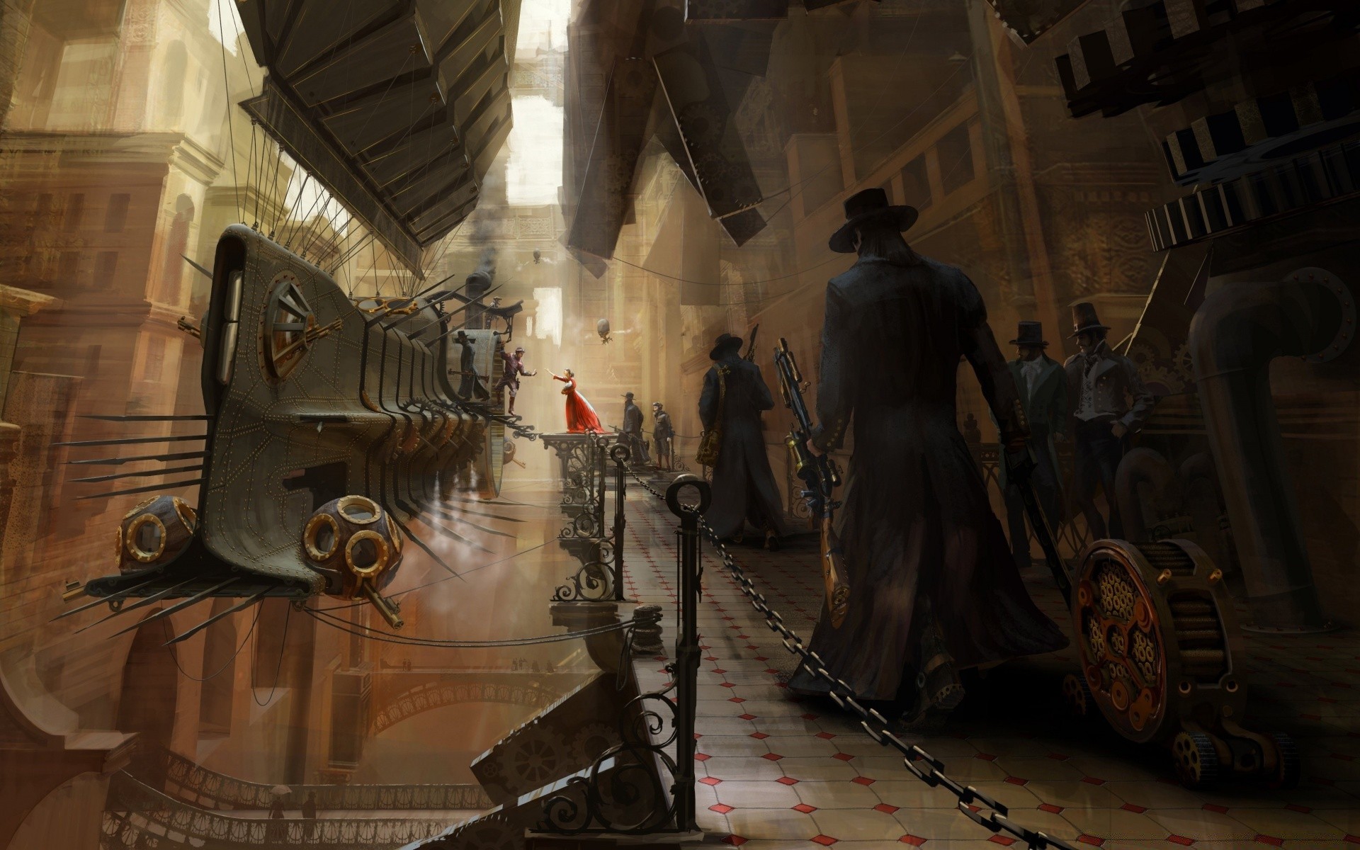 Ciudad steampunk. abordando el barco. hombre en el cilindroCiudad steampunk. Abordando el barco. Hombre en el cilindro