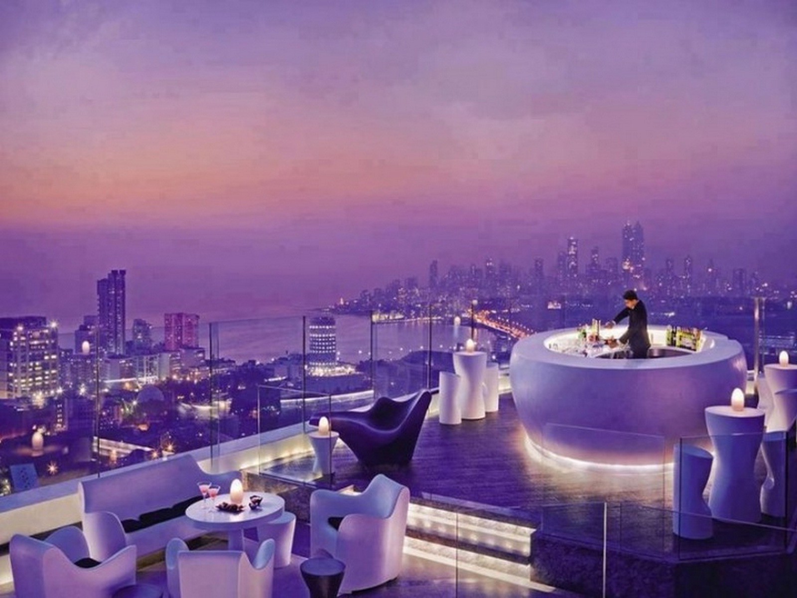 Noche lila, paisaje urbano, cafetería en la azotea