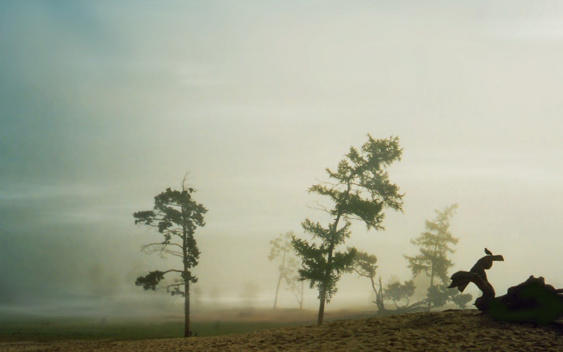 Árboles en la niebla en el fondo de la oscuridad
