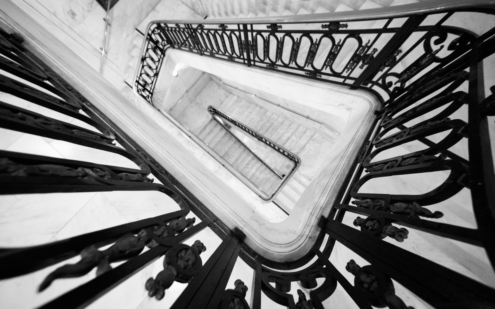 Escalera en blanco y negro con barandillas forjadasEscalera en blanco y negro con barandillas forjadas