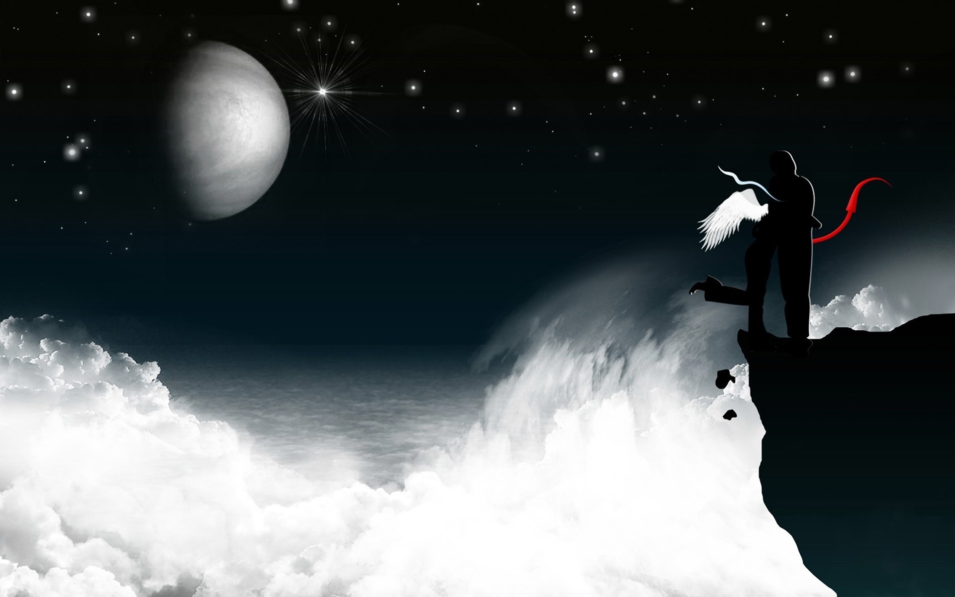 Un ángel y un demonio se abrazan de pie en una roca en las nubes
