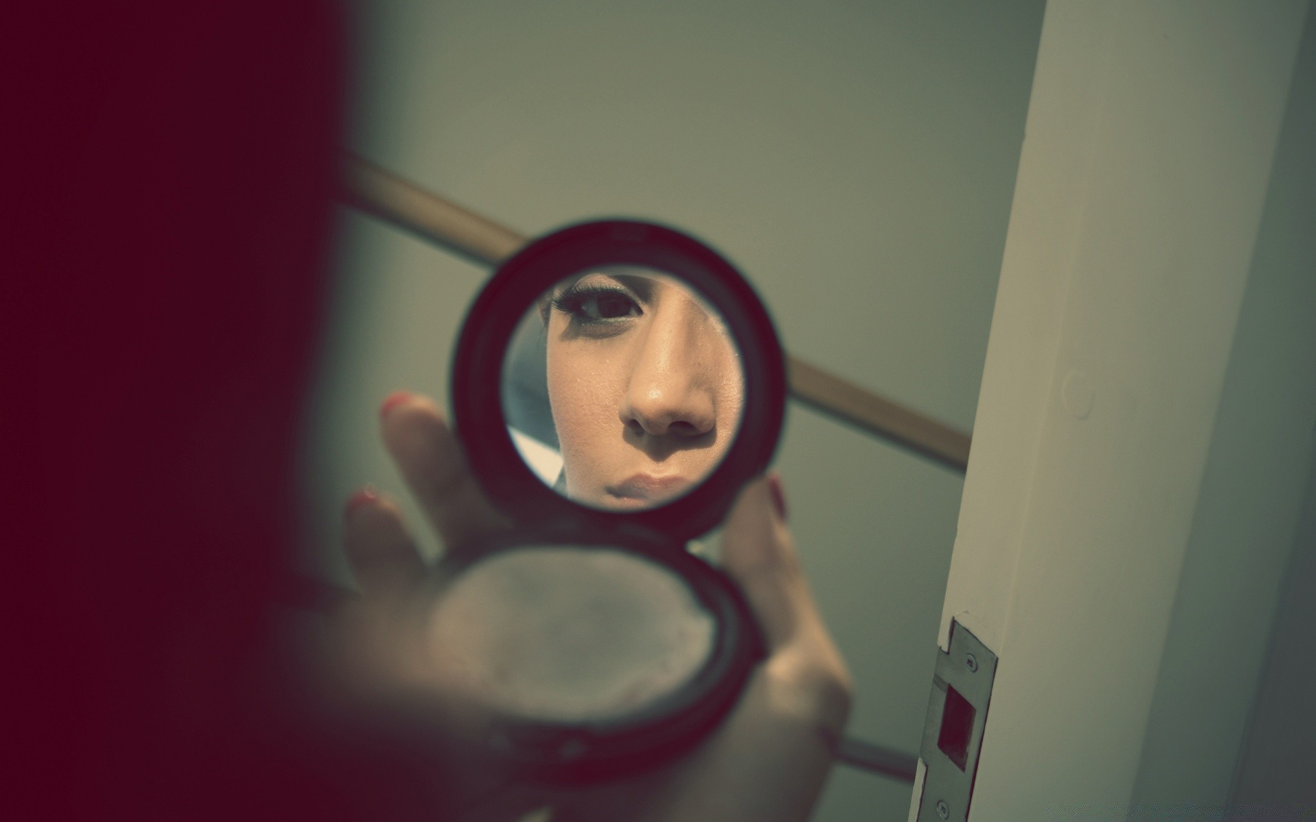 Foto de la reflexión de la mujer en el espejo de bolsillo