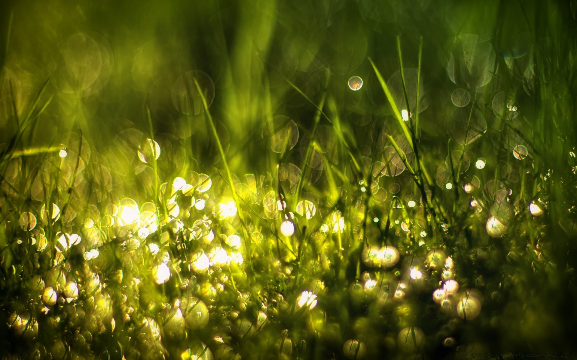 Rocío y gotas en la hierba de la mañana