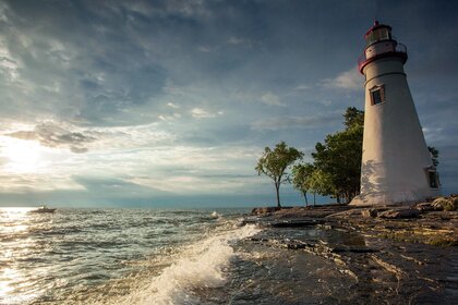 Faro en el fondo de los rayos púrpuras de la puesta de sol