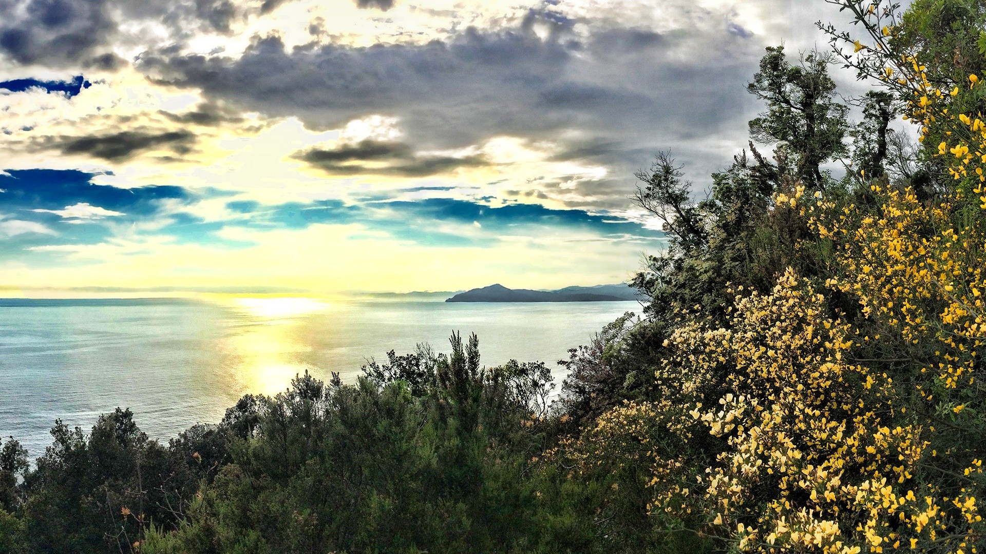 Cadena montañosa cubierta de nieve junto al agua al atardecer