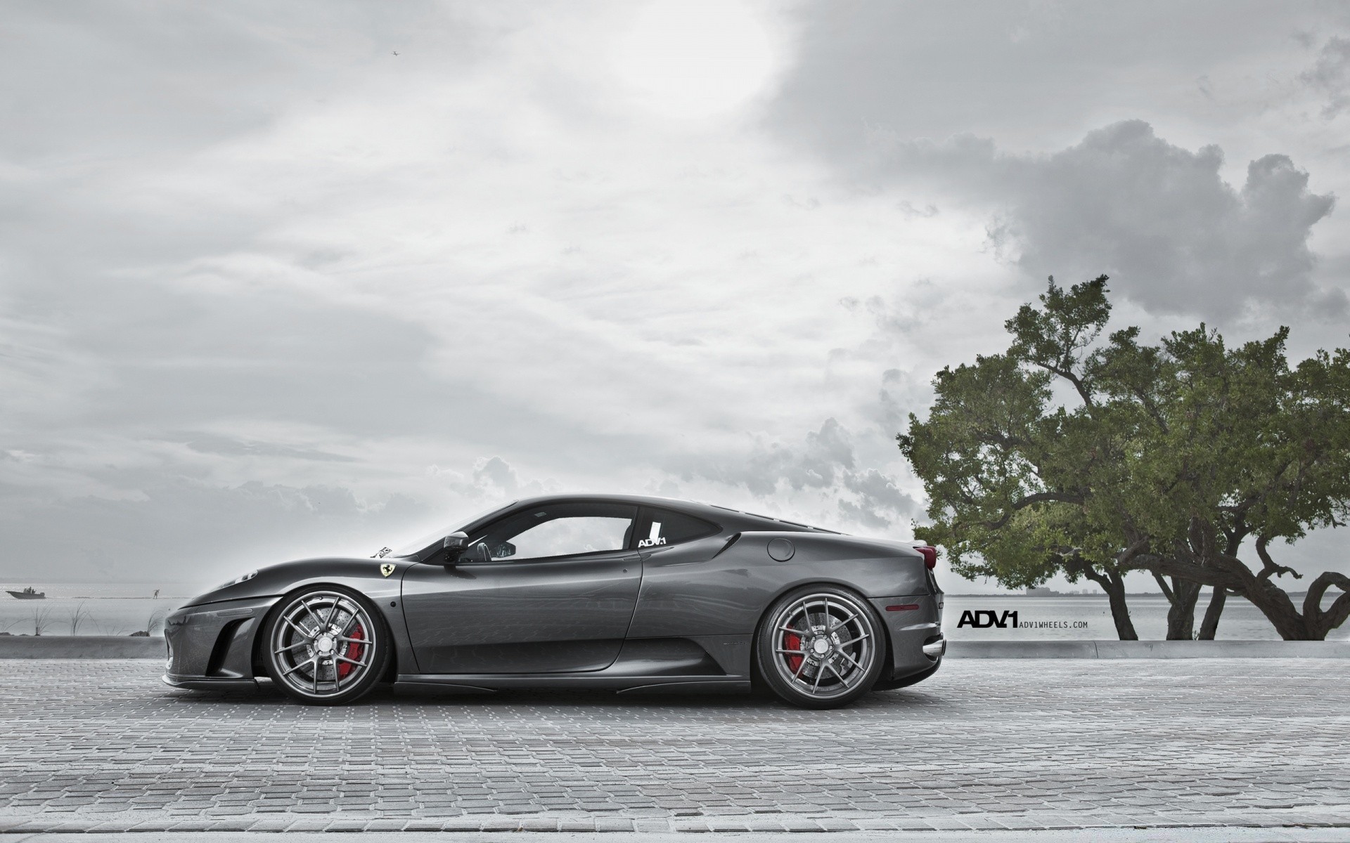 Ferrari rojo en un callejón oscuro con discos blancosFerrari rojo en un callejón oscuro con discos blancos