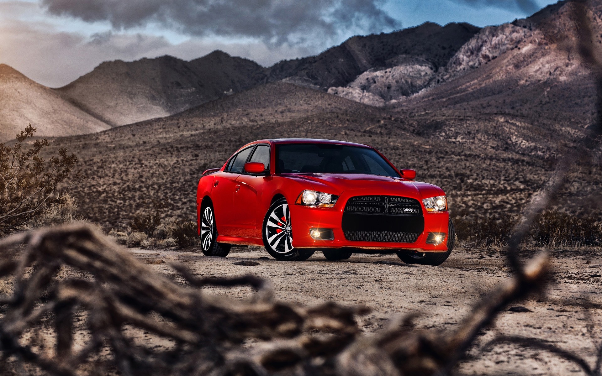Un Chevrolet rojo se encuentra en un camino de tierra contra el fondo de las montañas