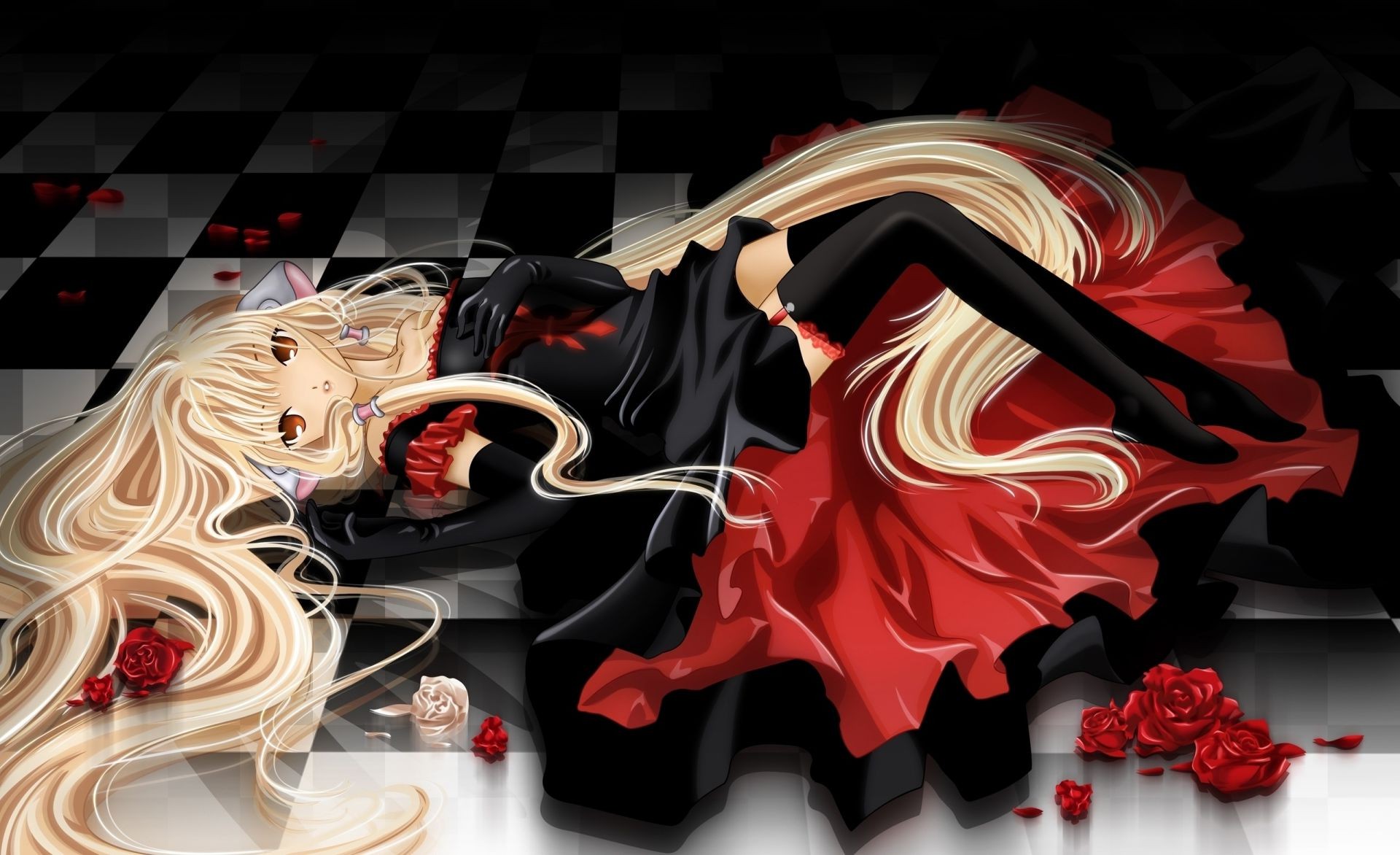 Anime heroína en medias negras sobre fondo rojo