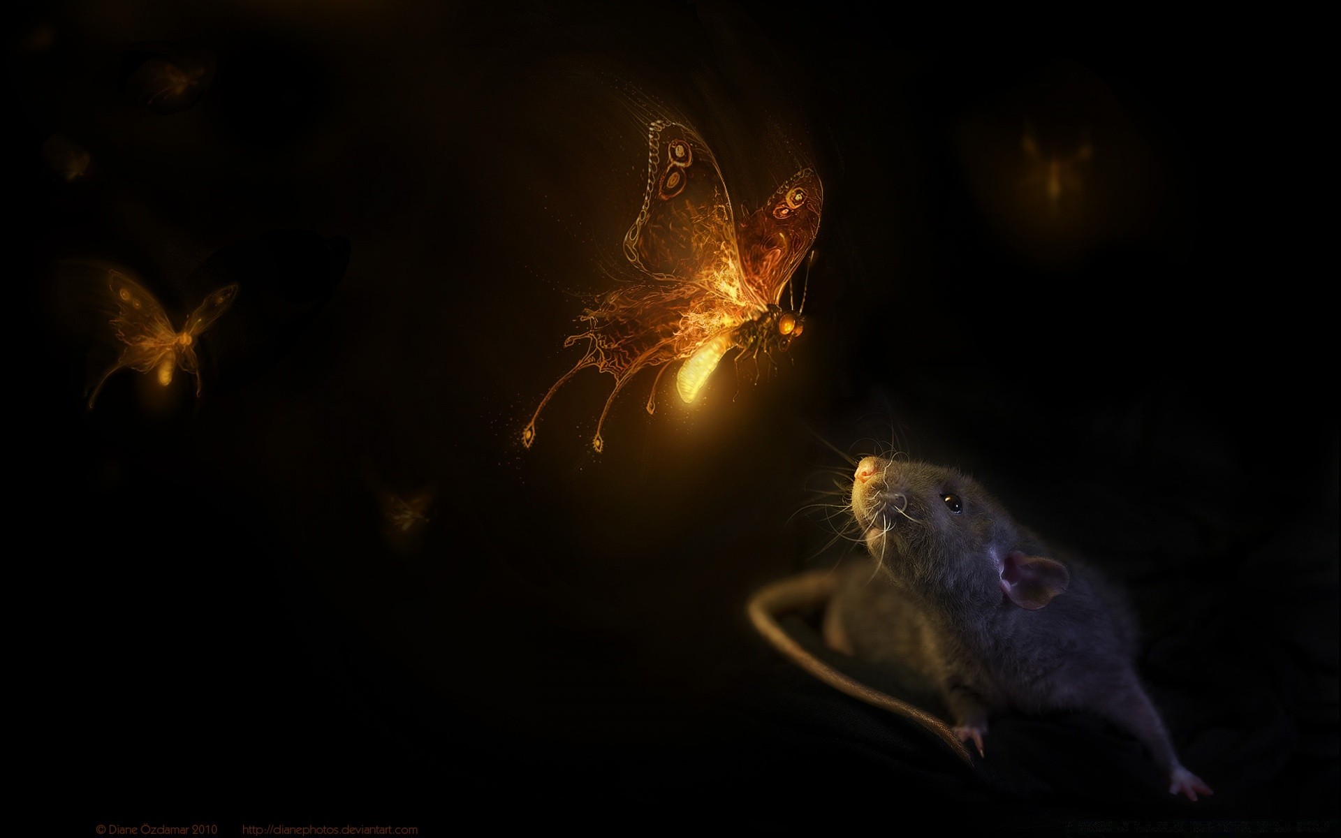 Fabulosas mariposas luminosas transparentes con ratón en la oscuridad