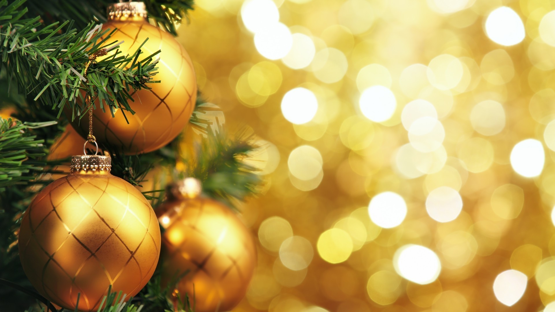 Ambiente festivo y bolas de oro en el árbol de Navidad
