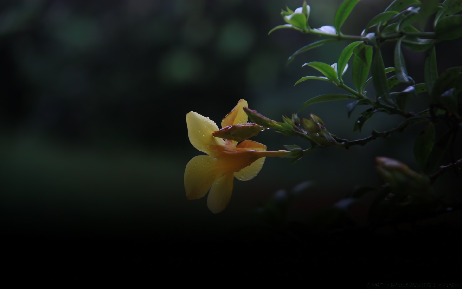 Flor amarilla. Follaje. Fondo borroso oscuro