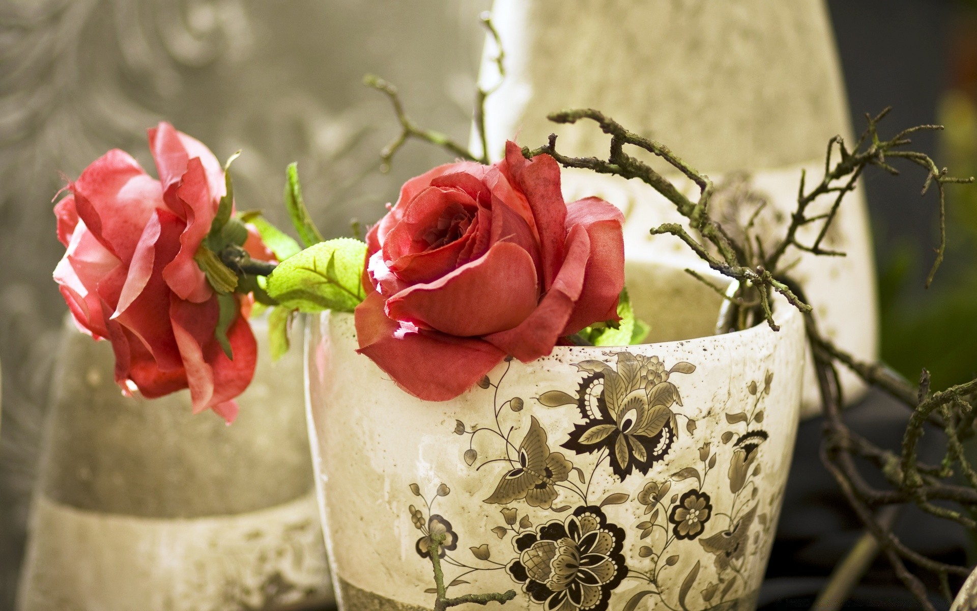 Dos rosas con raíces sobresalientes en una maceta blanca con patrones