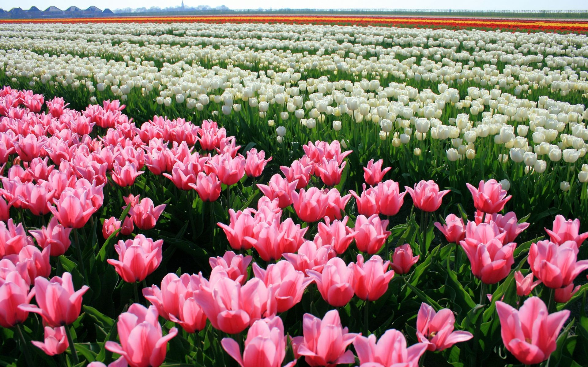 Campo de tulipanes rosa, blanco, naranja