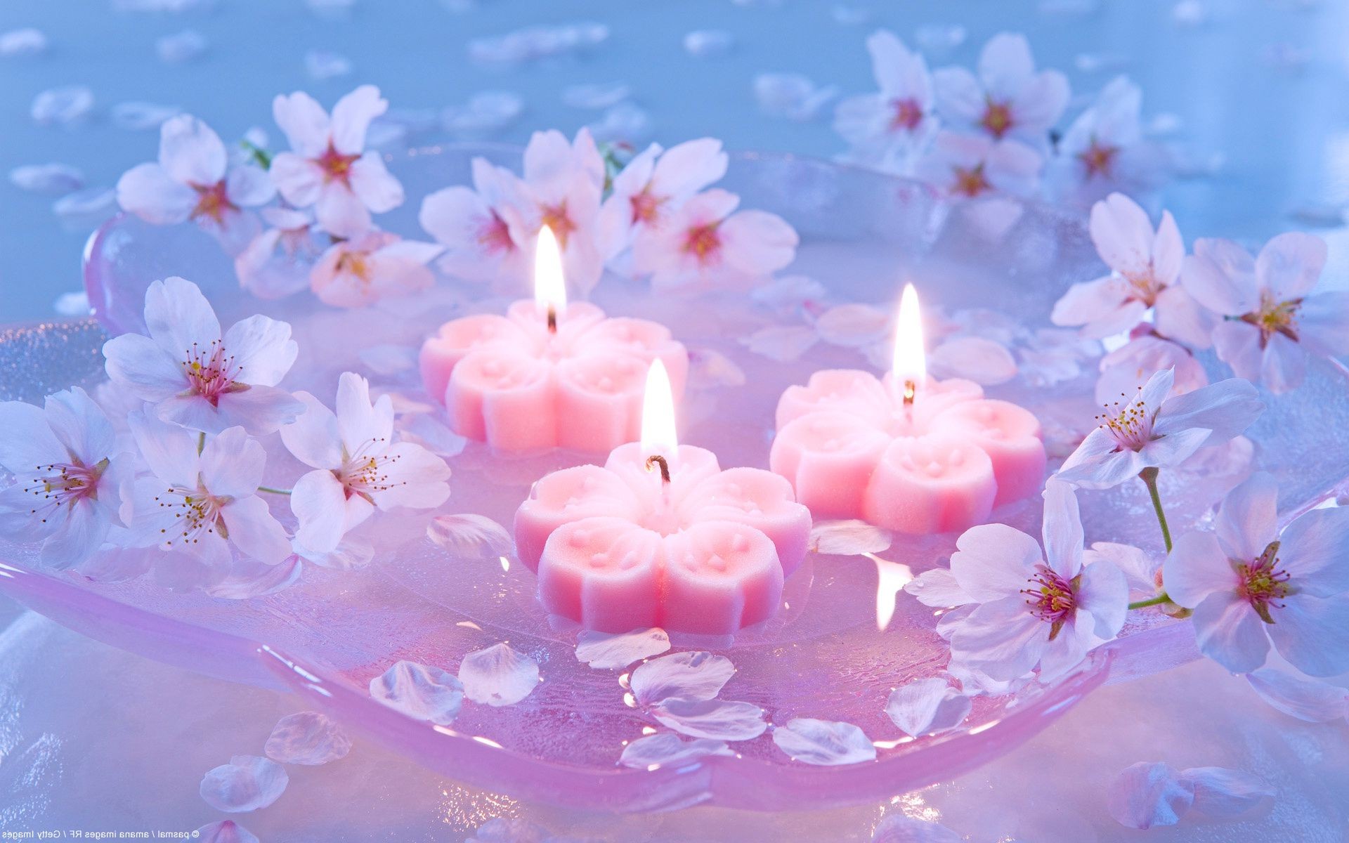 Velas de pétalos en un jarrón transparente