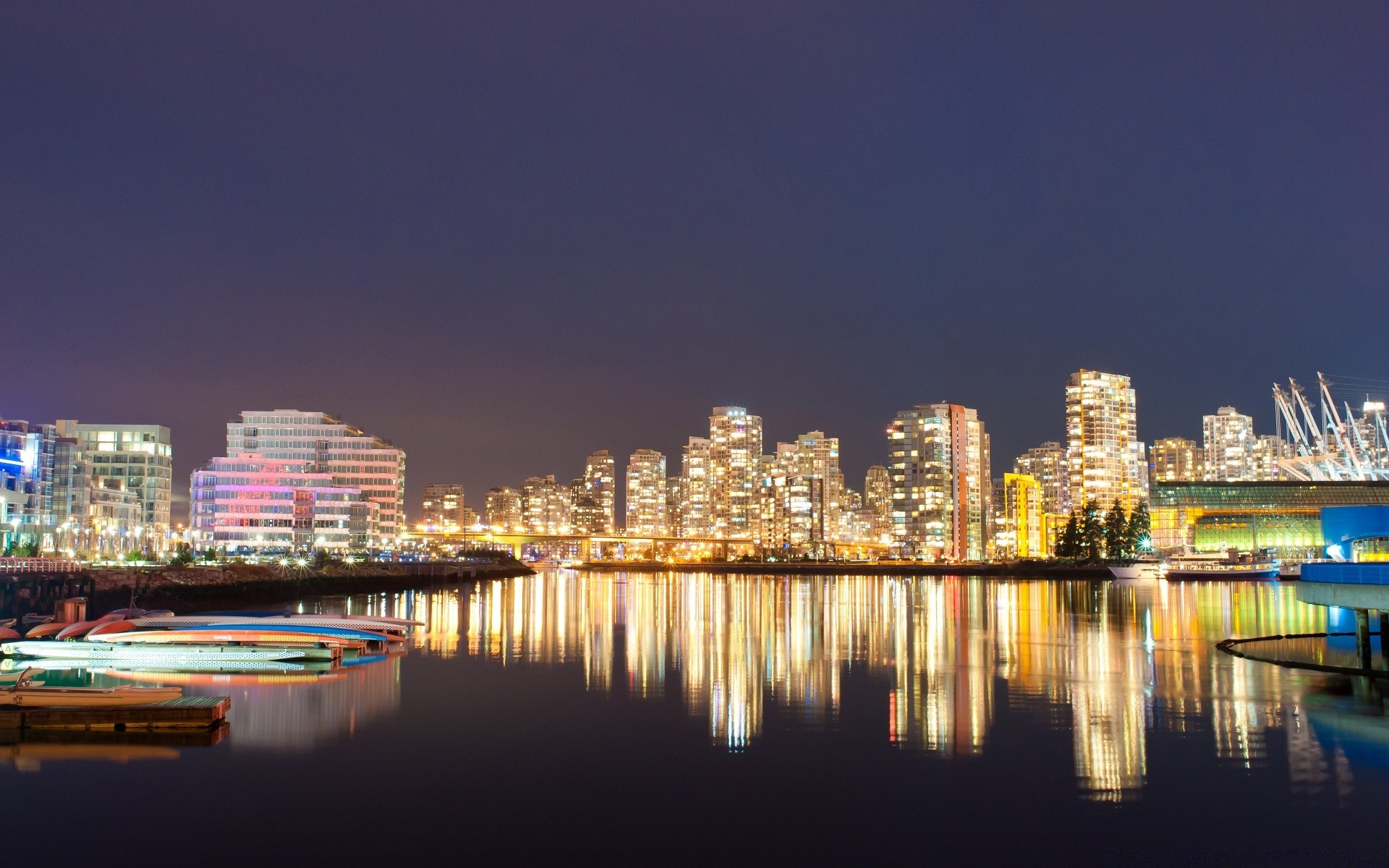 Hermosa Sakura. La iluminación de la ciudad se refleja en el agua