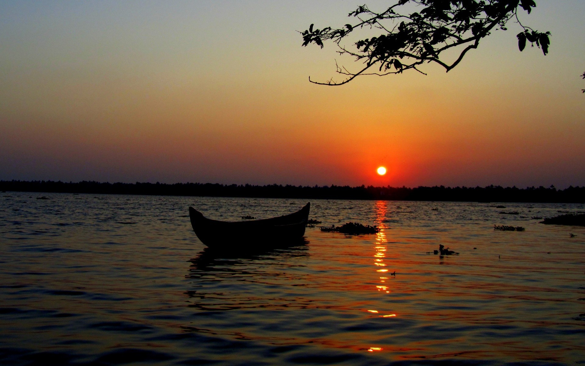 Barco en el agua en medio de una puesta de sol roja