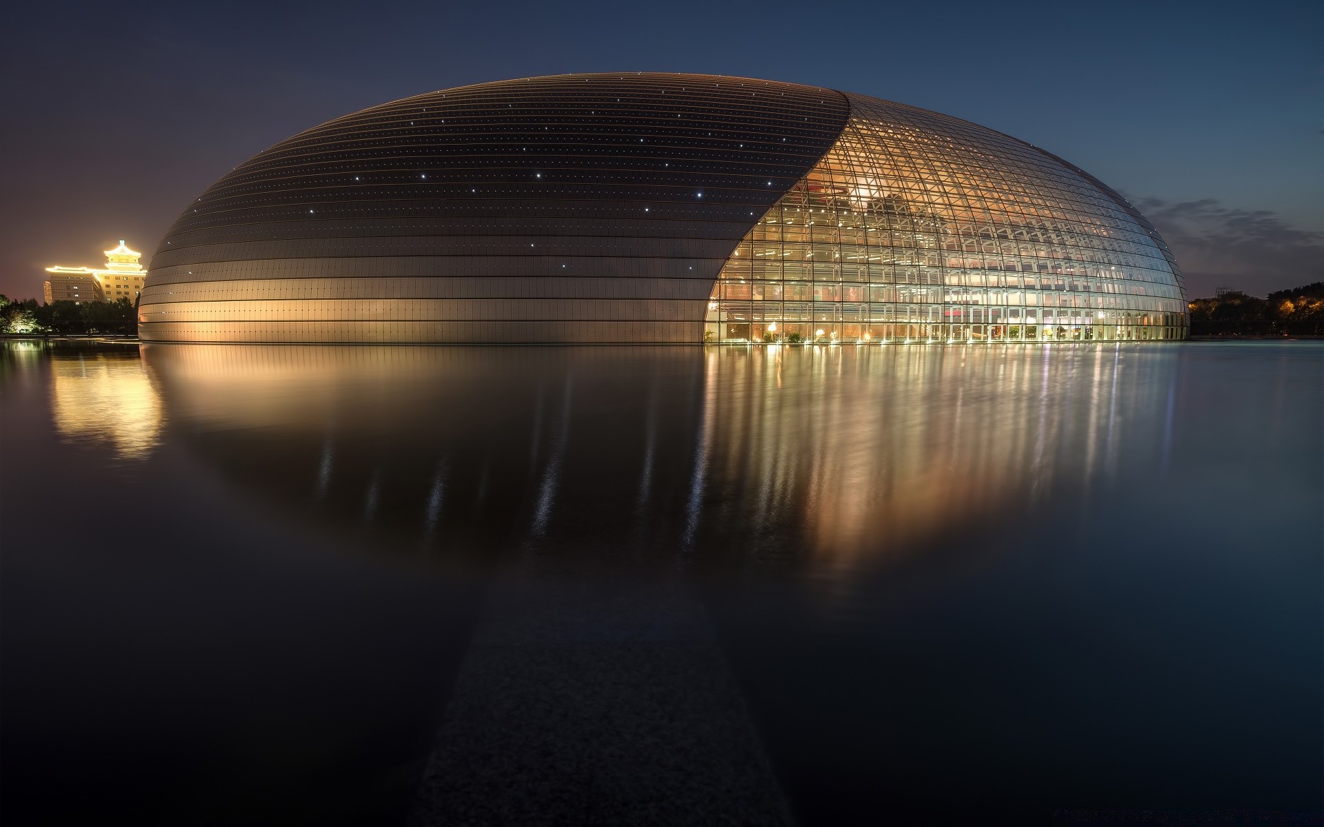 Puesta de sol sobre el templo con reflejo en el agua